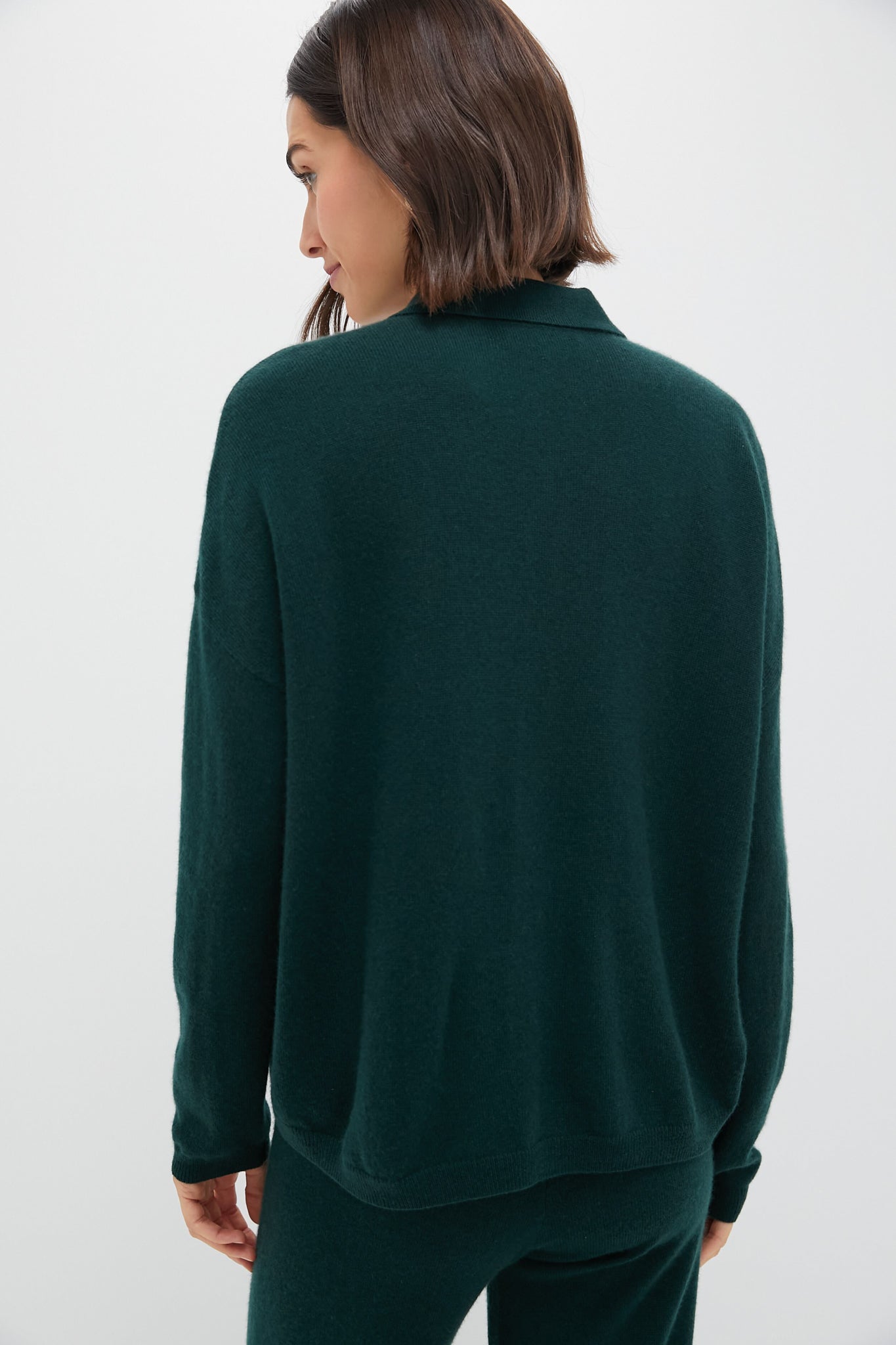 Borrowing details from a classic vintage menswear polo sweater. The Cashmere Polo Sweater fits straight and boxy through the body and sleeve and is finished with a short rib cuff and hem. The wide polo placket is adorned with natural shirting buttons. and a perfectly proportioned collar. Dress up with denim or maxi skirts. or opt for the matching Alpine The Cashmere Lantern Pant for a cozy set!
