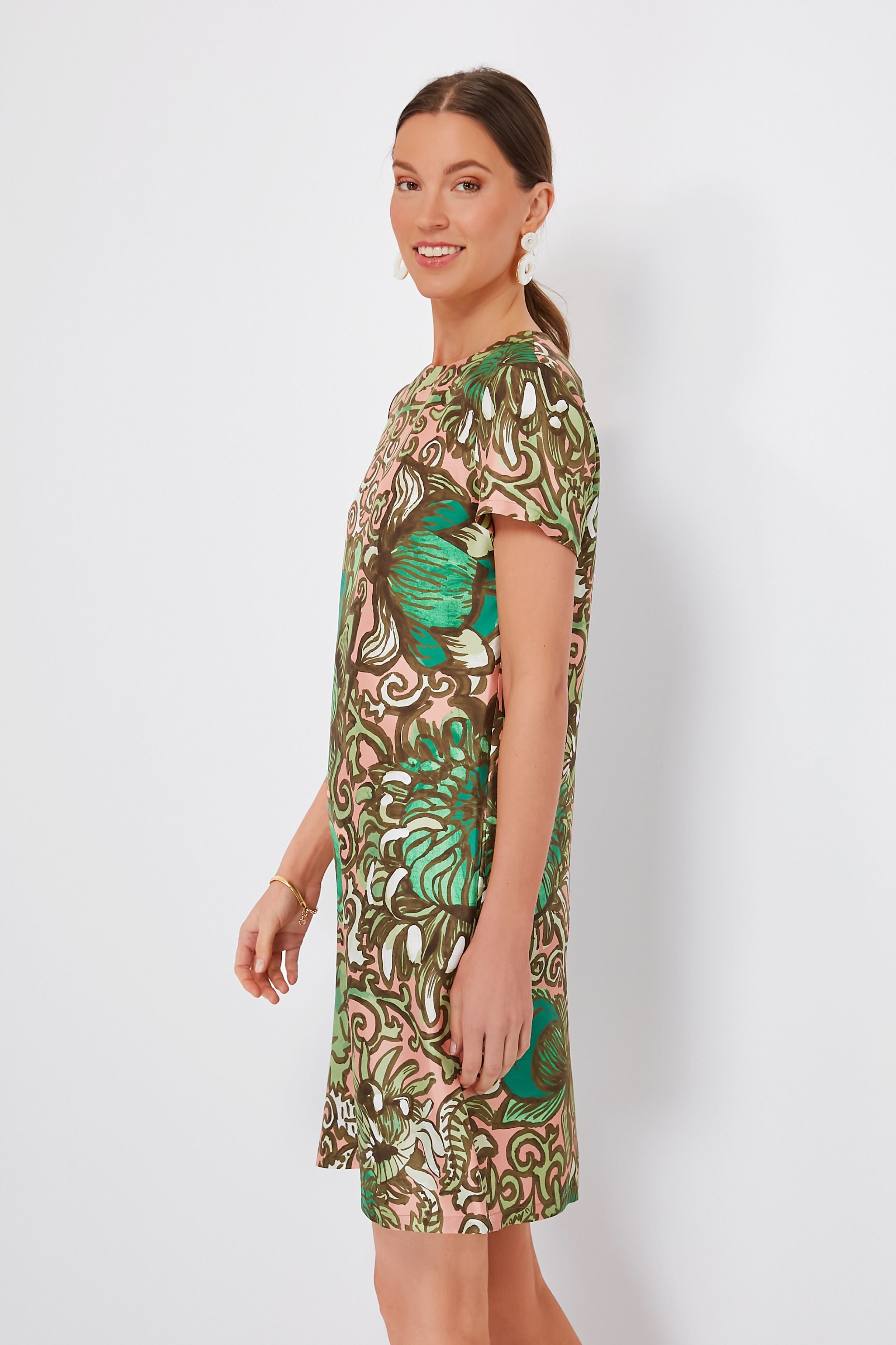 Take your signature swing dress. give it a generous chop. and voila! You've got the Anemone Pink Mini Swing Dress. The shorter version of this easy T-shirt silhouette falls around mid-thigh. perfect for showing off your legendary legs during those hot summer days. Made using the brand's silk twill which has a fluid drape and a glossy sheen. it works just as well for daytime (with a pair of tights) as it does night (polished heels all the way). From dressy lunches followed by a matinee to evening drinks with the gals. we love the elevated yet effortless nature of this mini.