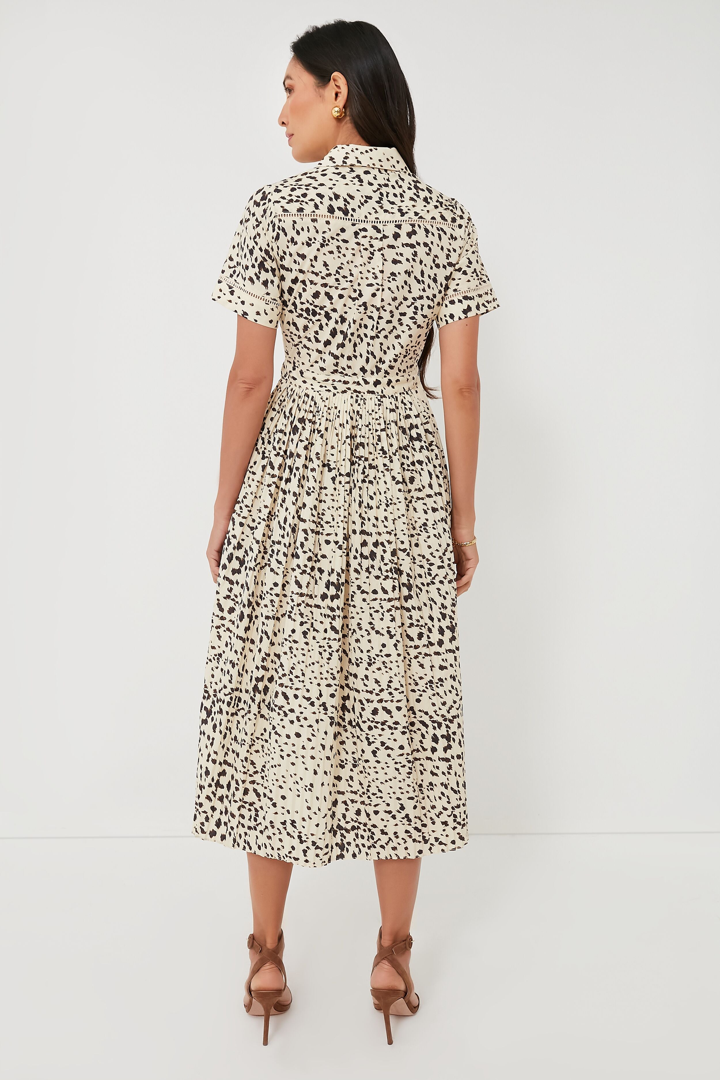 We are wild about the Animal Colby Dress. Beautifully printed in a gorgeous midi silhouette. this beauty features a spread collar. front button placket. and an adjustable drawstring waist for a flattering fit. The full. pleated skirt allows for easy movement. perfect for dancing in the kitchen with friends and family after a long day. We are styling this piece with flats and a shoulder bag for an elevated. daytime look. then opting for kitten heels and gold jewelry for evening.