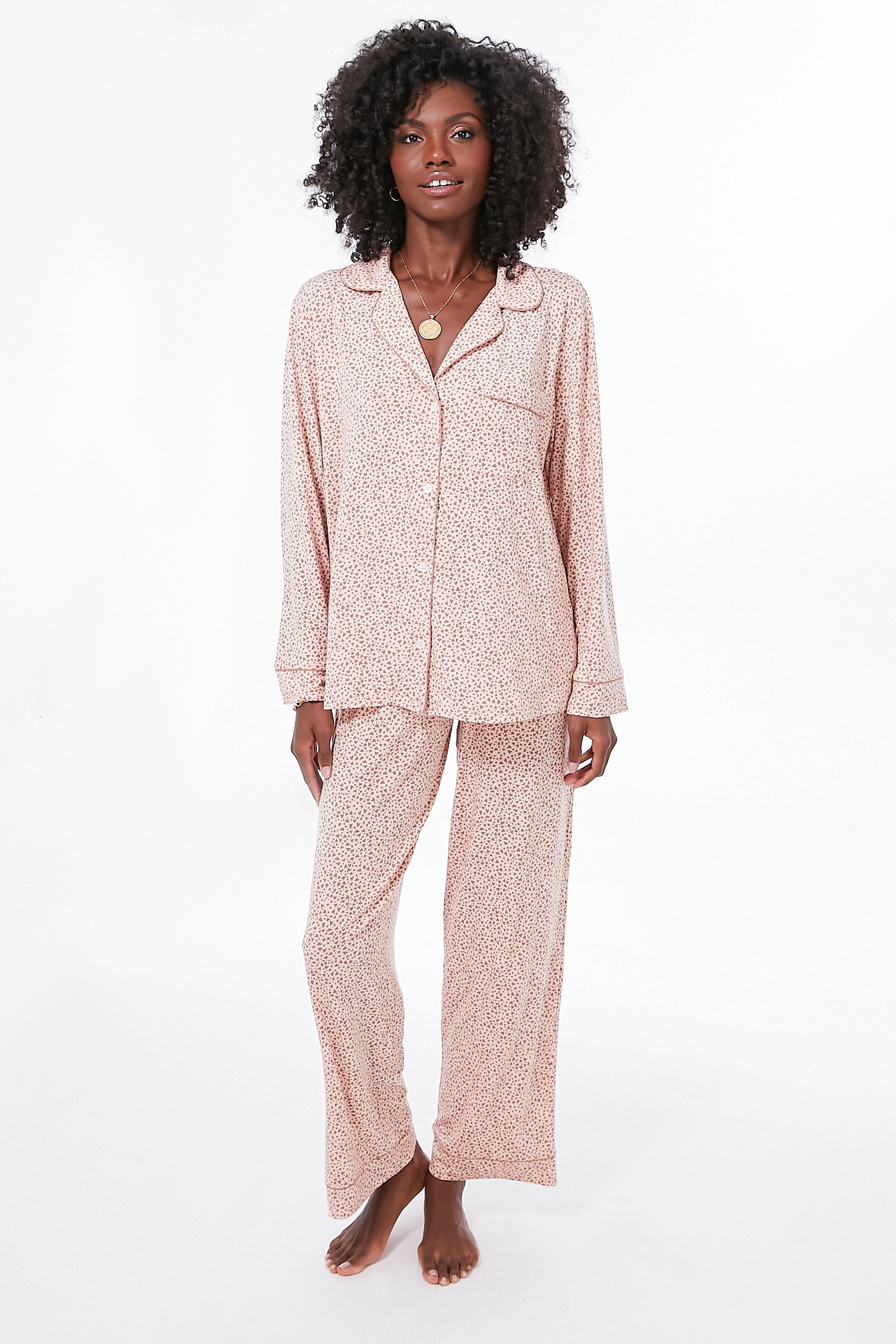 The Animal Mocha Long PJ Set set features a subtle all-over leopard heart print with a cozy silhouette. Super soft with a tailored fit. these pajamas hug your body and fall in all the right places. A Beilave favorite. these make for a great gift for a loved one (or buy them to treat yourself – we won't tell)!