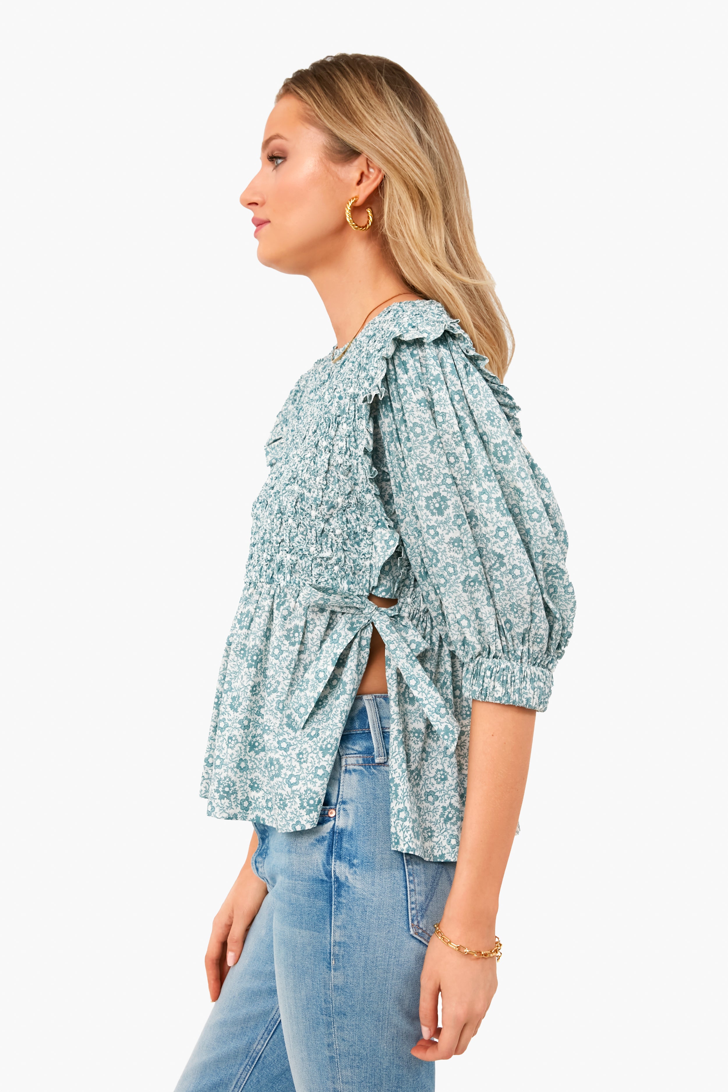 The Apple Green Ida Print Puff Sleeve Smocked Top features a crewneck. smock bodice. three-quarter length puff sleeves and a flatter peplum waist. Made from cotton. this style is ready for sunshine! Add wedges and gold jewelry for a resort-ready look.
