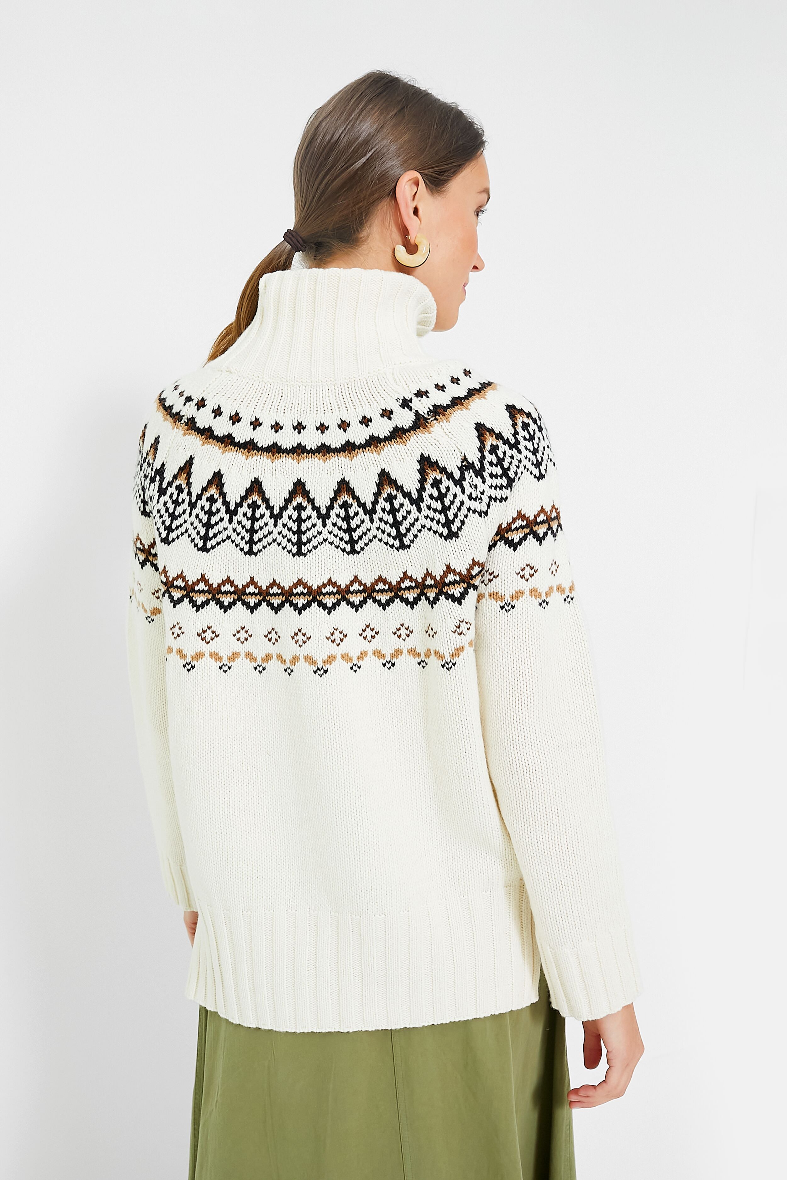 A fresh take on Fair Isle. the Aran Mersea Knit is keeping us cozy this season. With a high turtleneck. long sleeves with ribbed cuffs. and a slightly relaxed fit perfect for layering or tucking in. this sweater is exactly what you need for sitting by the fire. sipping a hot toddy. or braving the cold. Pair with a midi skirt and tall boots to dress it up. or keep it classic with denim and gold hoops for everyday wear.
