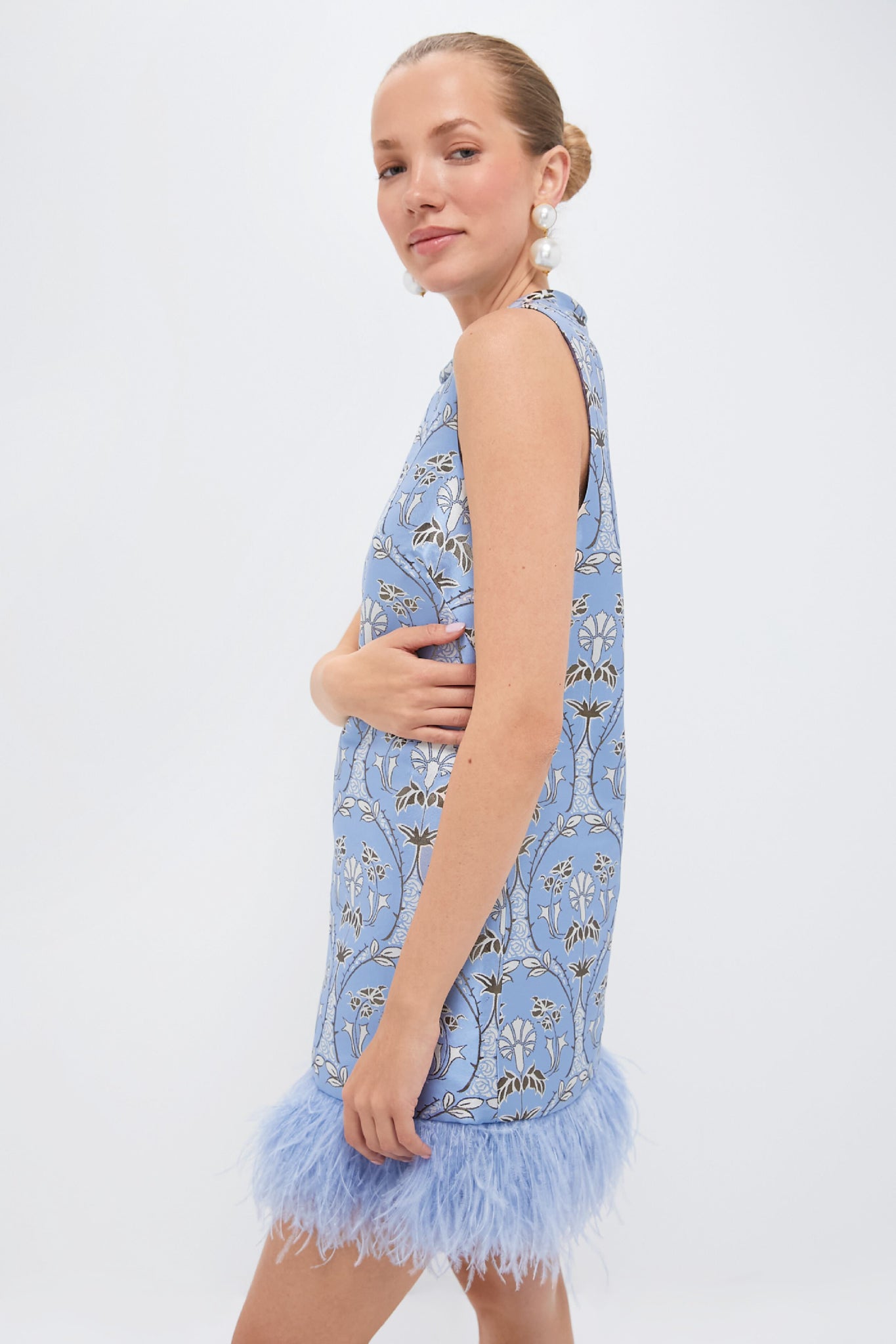 The Arcada Light Blue Paige Dress features a stunning and delicate fabric in a classic silhouette. With a shift shape. tubular neck trim. and decorative feathers at the hem. this dress is sure to turn heads! We recommend pairing with statement pearl earrings and a silver handbag and heels!