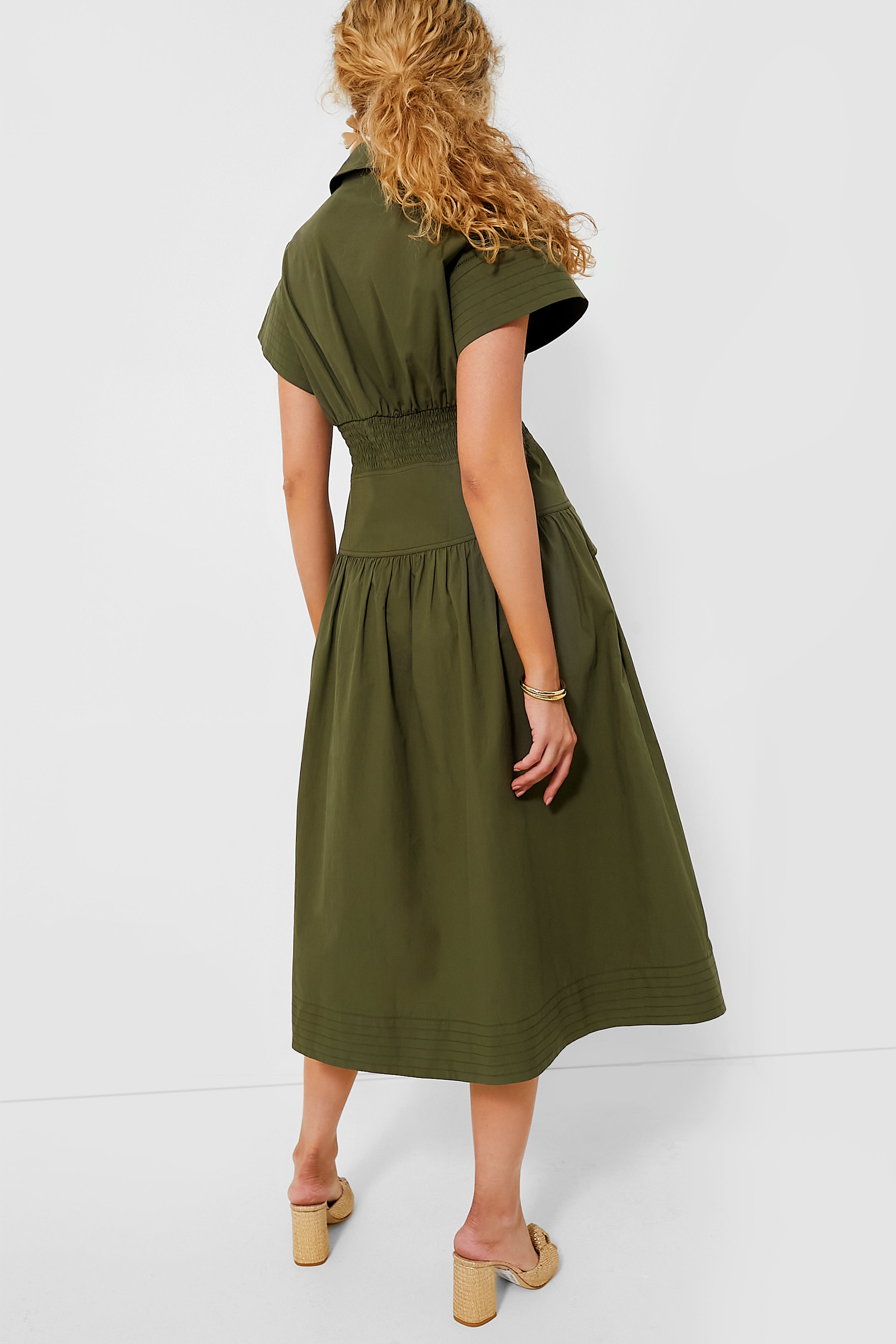 The Army Green Cameran Dress is the perfect work dress uniform. with a half-length hidden button placket. a smocked empire waist. and trapunto stitching on the sleeves and hemline. this dress is sure to get everyone's attention. Perfect for a day at the office or at lunch with friends. we are styling this with a raffia block heel and statement earrings or with neutral toned ballet flats and a clutch.