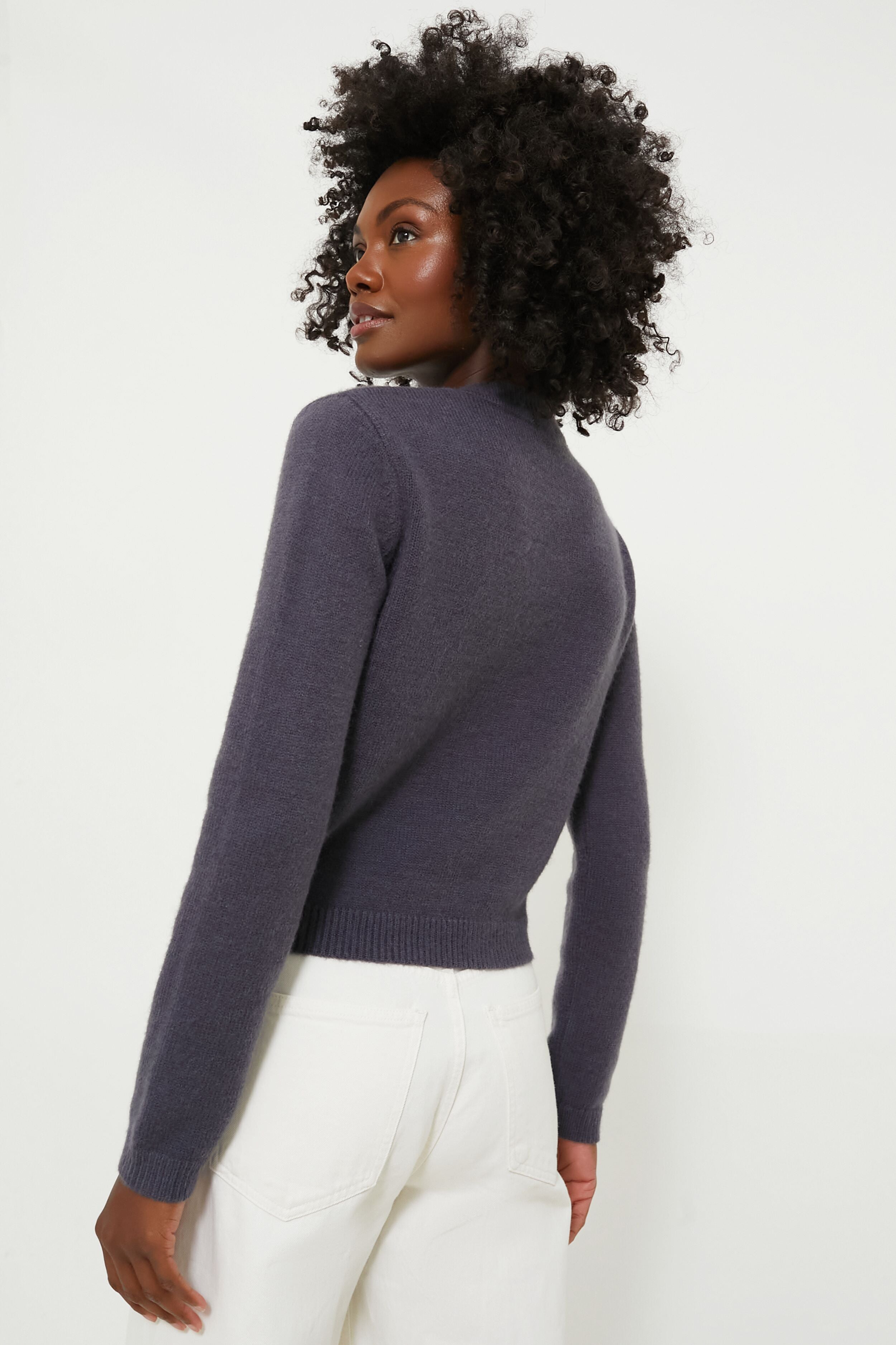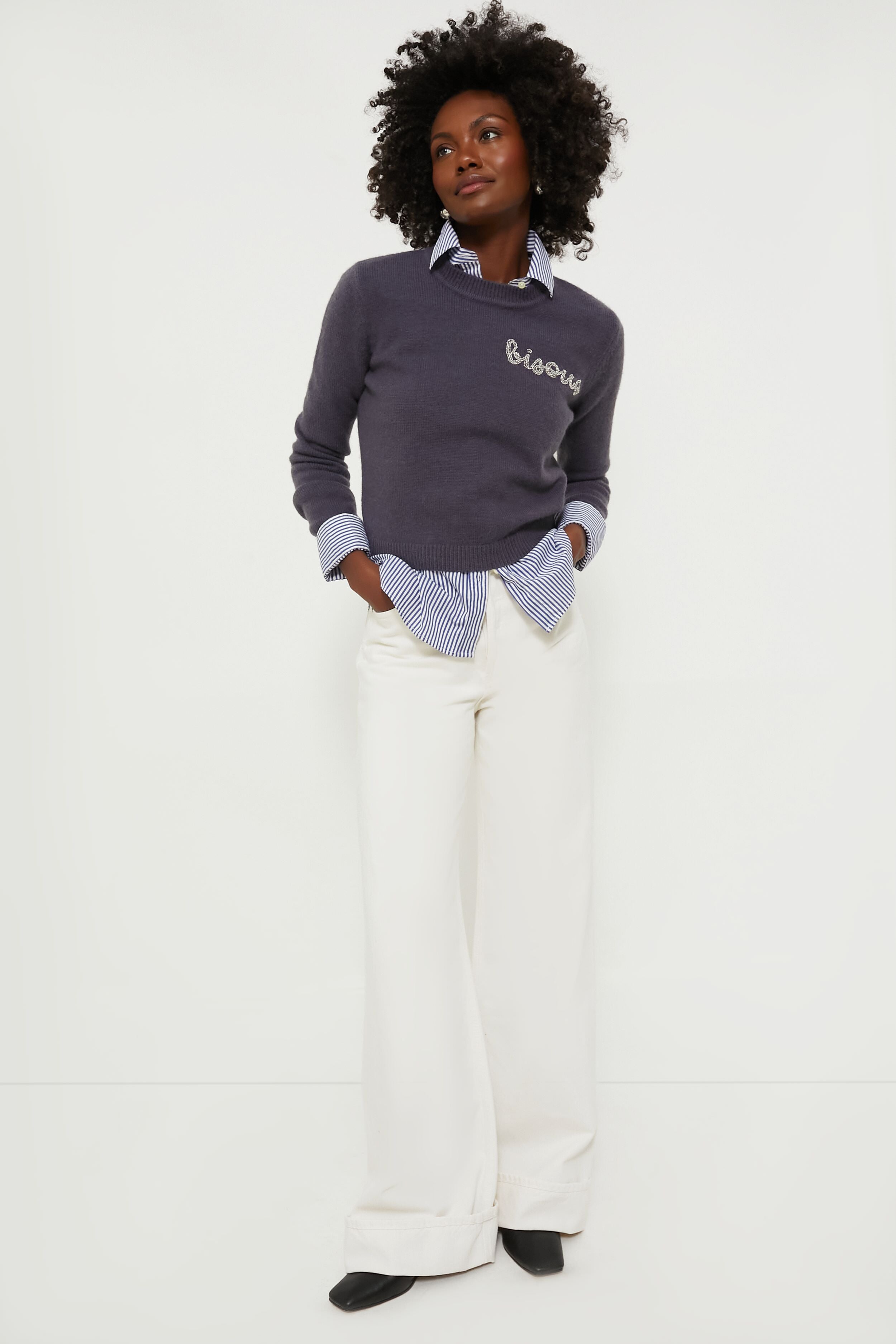 Made from the softest yarn. this Gray Crewneck Sweater features a beautiful beaded embroidered “Bisous” on the front. A lovely addition to your closet. this slim-fit style has a subtle touch of love you won't find anywhere else. We recommend styling it over a button down. with denim. and a ballet flat.