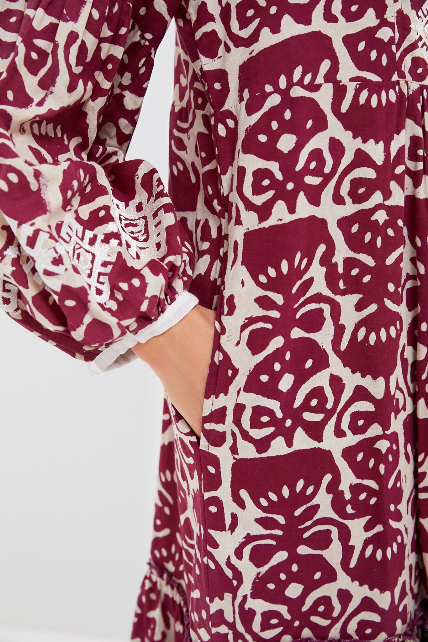 Adorned with a beautiful print that elevates this Aubergine Sannar Dress to new heights. this maxi's split neckline. blouson sleeves. and relaxed A-line silhouette all come together to create a boho-chic styling that's perfect for beach days and warm getaways alike. Pair with sandals and a sunhat to chill poolside or with a tote bag and sunnies for all kinds of weekend adventures.