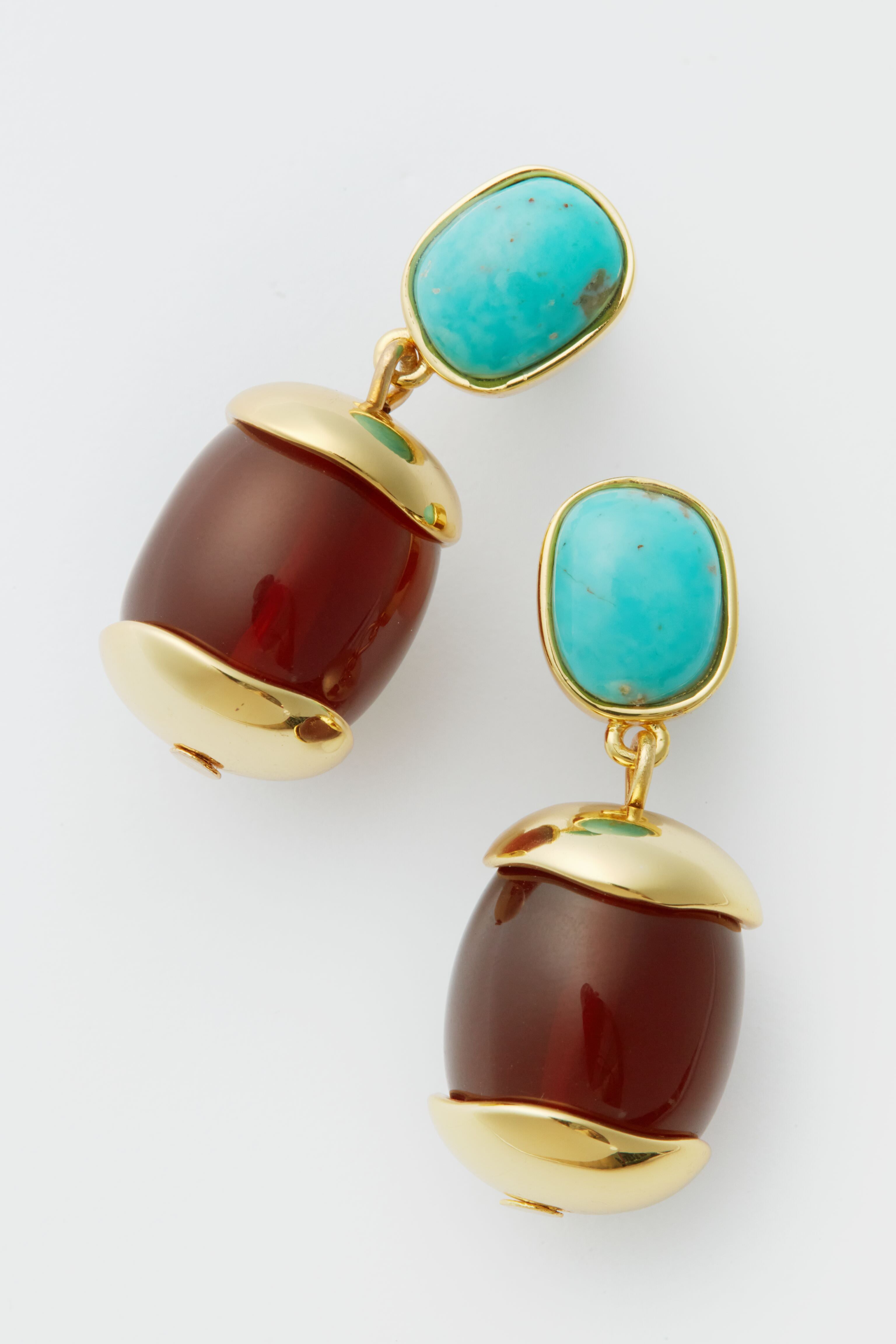 Contrasting turquoise and rich chestnut-hued resin come together to great the Canyon Earrings. These artfully crafted drops are the perfect finishing touch to any outfit. Lean into the fall color palette and pair with a rich neutral sweater and winter-white pants. or dress up your staple t-shirt and jeans. The ways to style these beauties are endless.