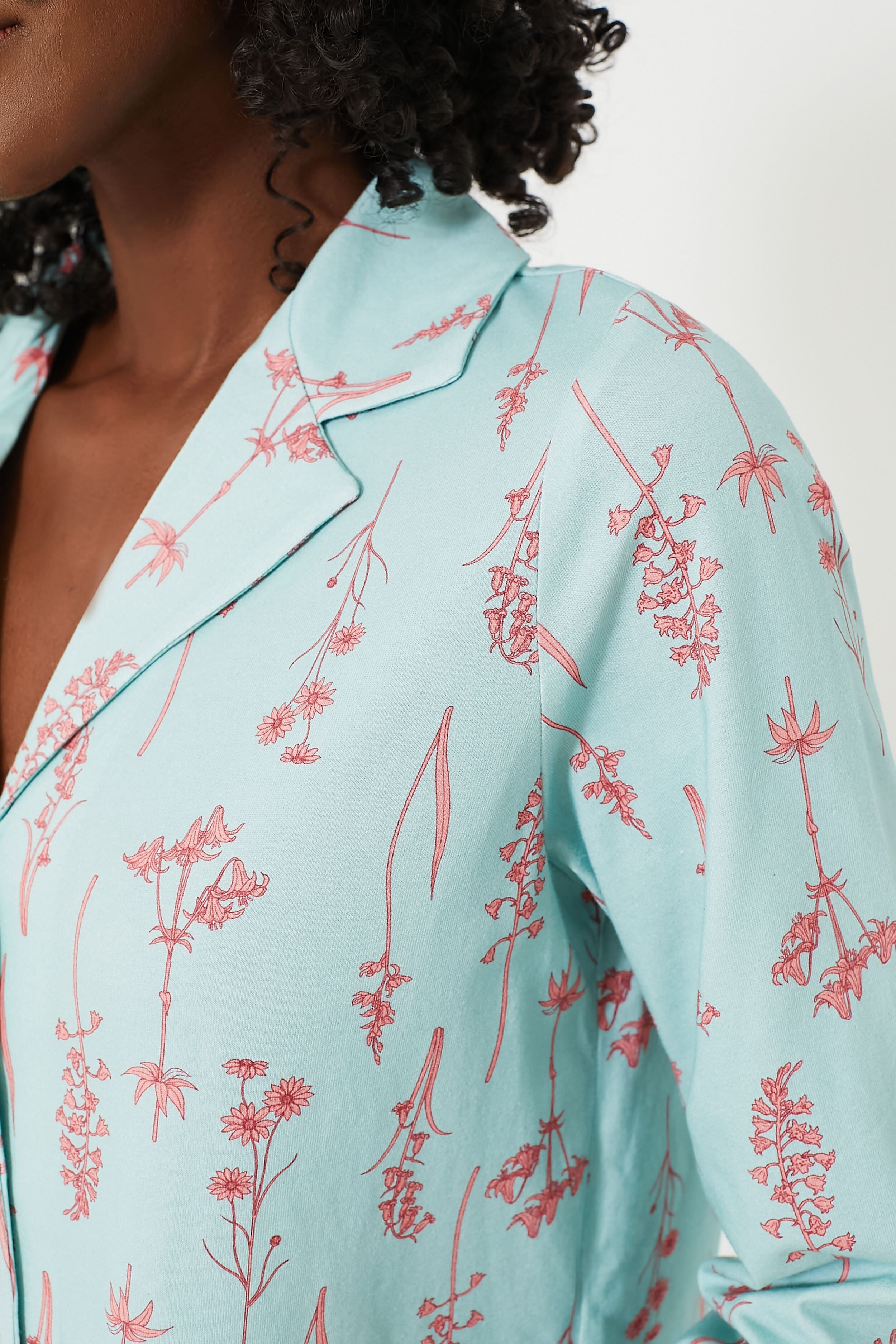 Drift off to dreamland knowing you look cute with the Beatrix Short Pajama Set. Printed with a pink herb motif on a subtle turquoise background. this style is crafted from the best quality cotton jersey that is thermal regulated and adapts to all seasons. A roomy shape. flexible elastic waist. small slits on the sides. – these pajamas are a no brainer!