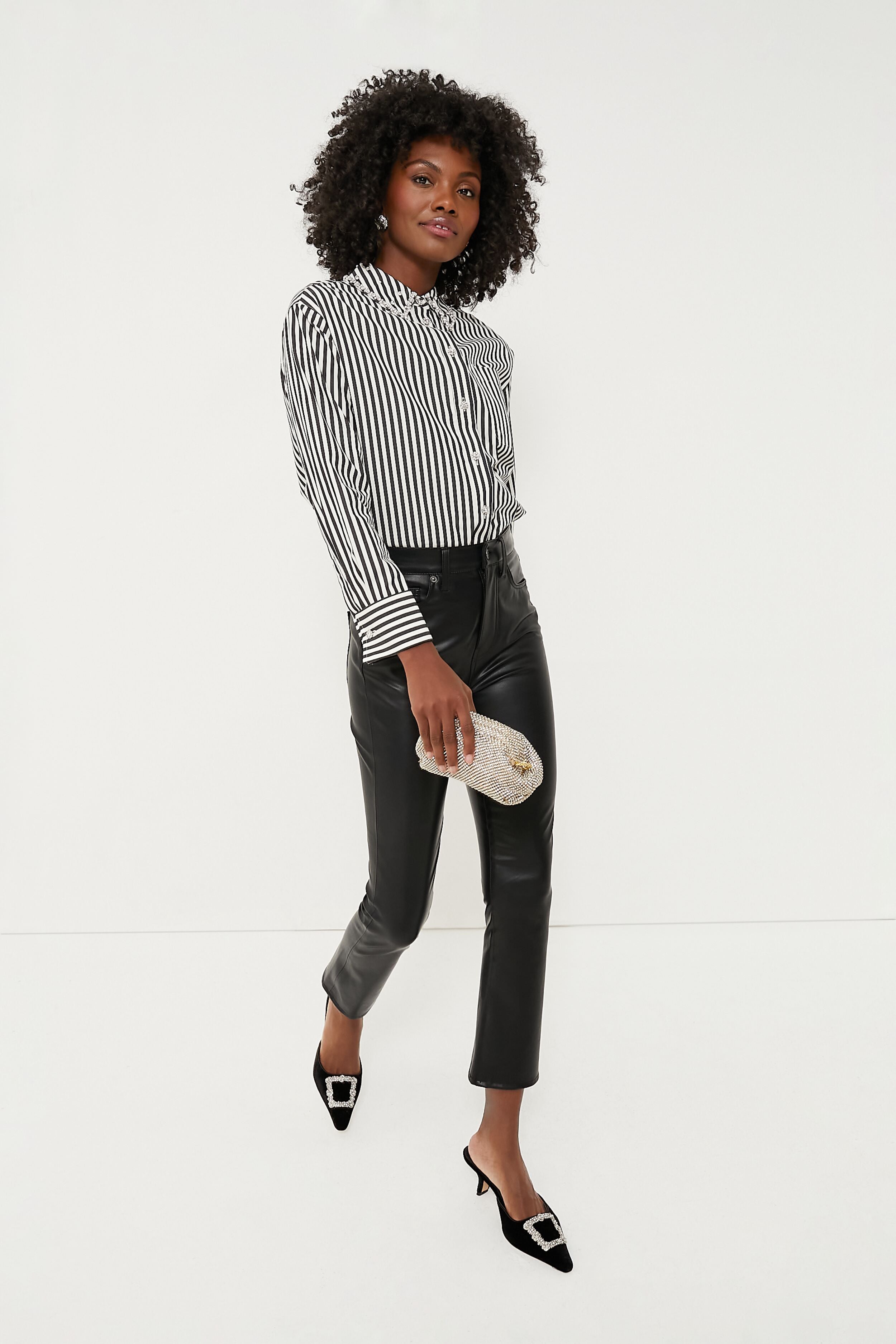 Your go-to button-down just got an upgrade with the Black and French Cream Acrobat Stripe Embellished Shirt by Kate Spade. Built with a classic silhouette. this top is elevated with a pinstripe pattern and rhinestone detailing. Pair with black pants and heels or sneakers for an outfit that is sure to get compliments.