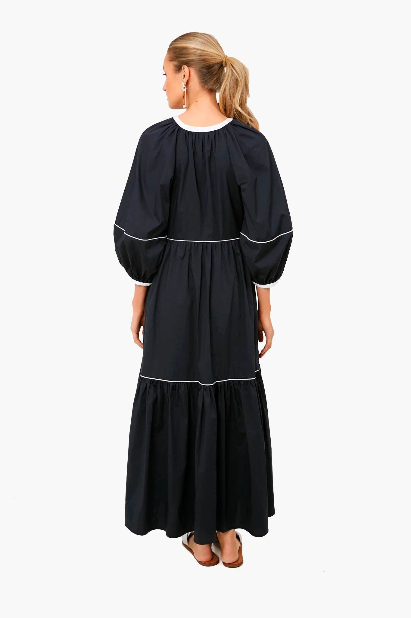 The Black And White Demi Dress is made from crisp cotton with contrast white trim. This midi has a button front placket. full skirt. and three-quarter oversized blouson sleeves. Wear with sunglasses and sandals for a vacation-ready. sun-kissed look.