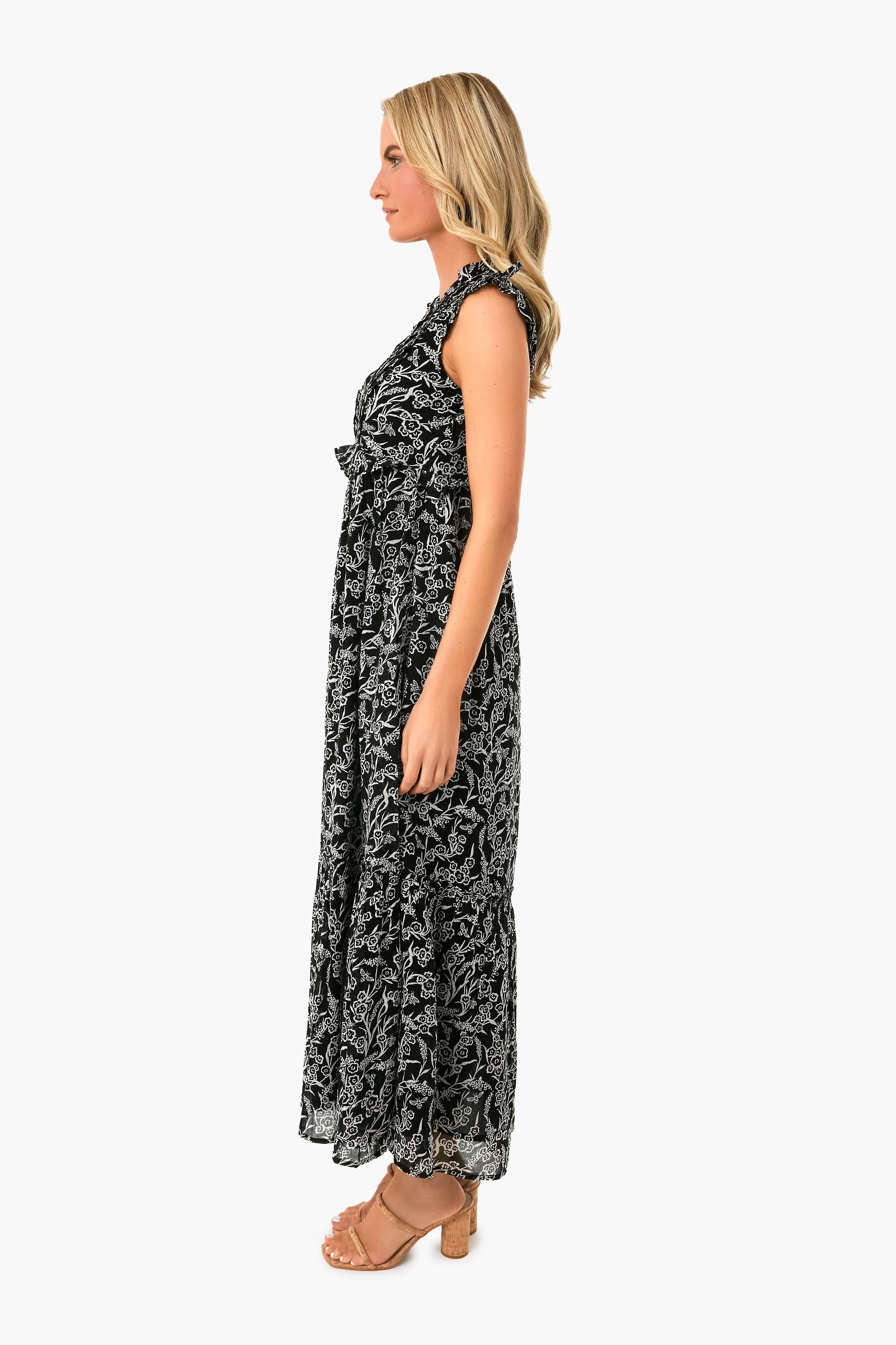 The Black Bumble Constance Dress is the feminine. floral maxi you need to complete your fall wardrobe. A subtle ruffle that flatters the neckline. waist. and shoulders plays for a flirty and romantic look while the dark color palette adds edge and contrast. Add sandals for outdoor dinner soirees. but it's just as chic on a cool morning with a fine-knit turtleneck underneath and boots.
