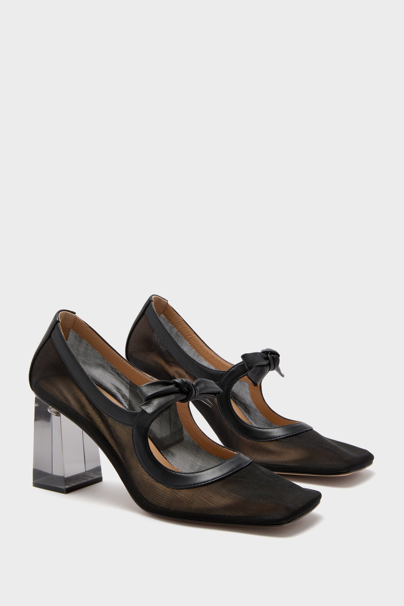 The Cecily Heel captures the eye with a transparent block heel made from lucite that reveals a hint of the internal hardware. It is crafted from a fine mesh fabrication in wardrobe-friendly black and is trimmed with leather that fastens into a playful front bow. Pair with elegant gowns or flirty LBDs for an eye-catching touch!