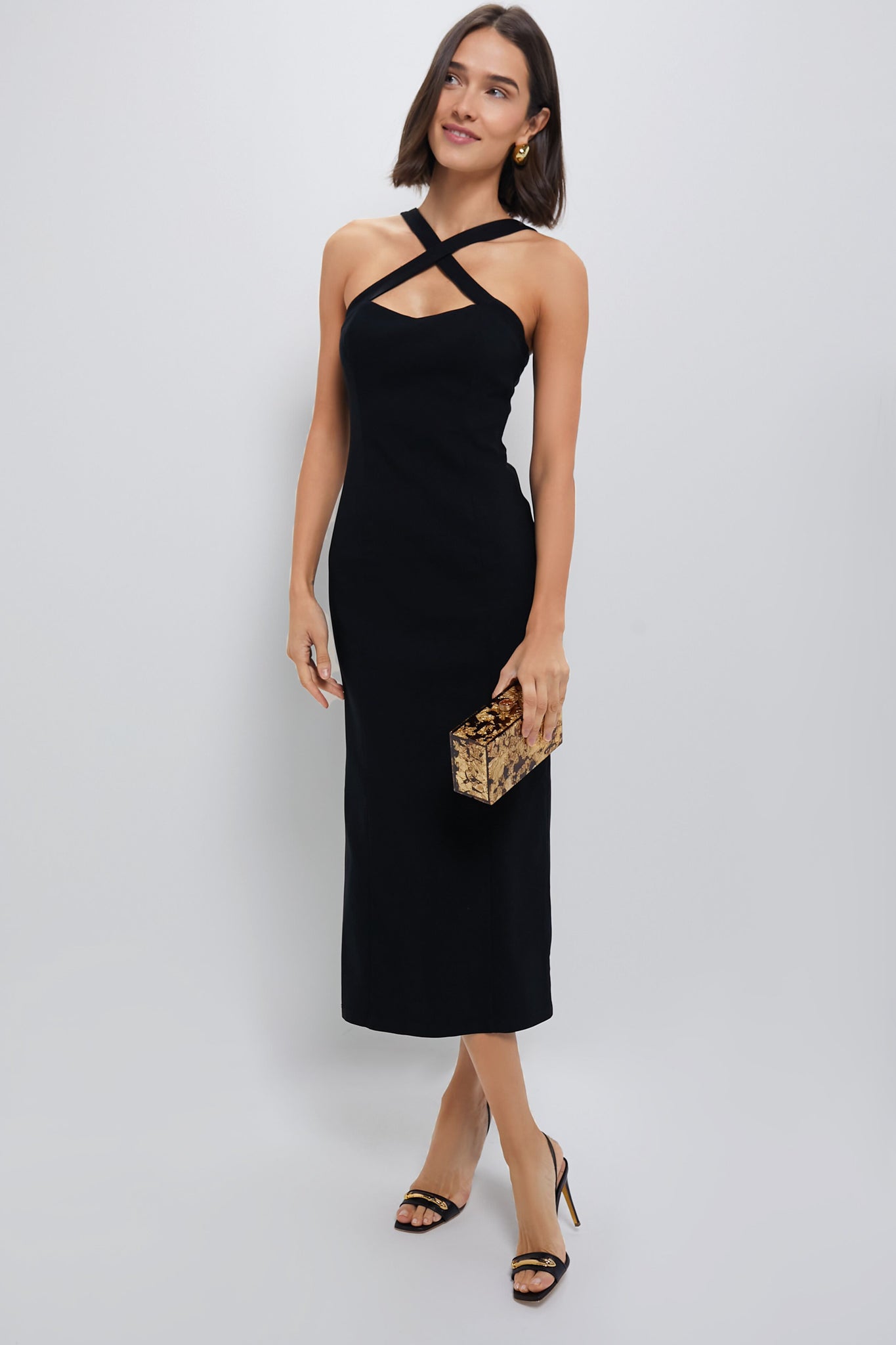 We are obsessing over the chic details of the Alice Dress. This form-fitting silhouette features criss-cross straps with a front keyhole and a luxe crepe fabric. Pair with heels and a clutch for a sleek look!