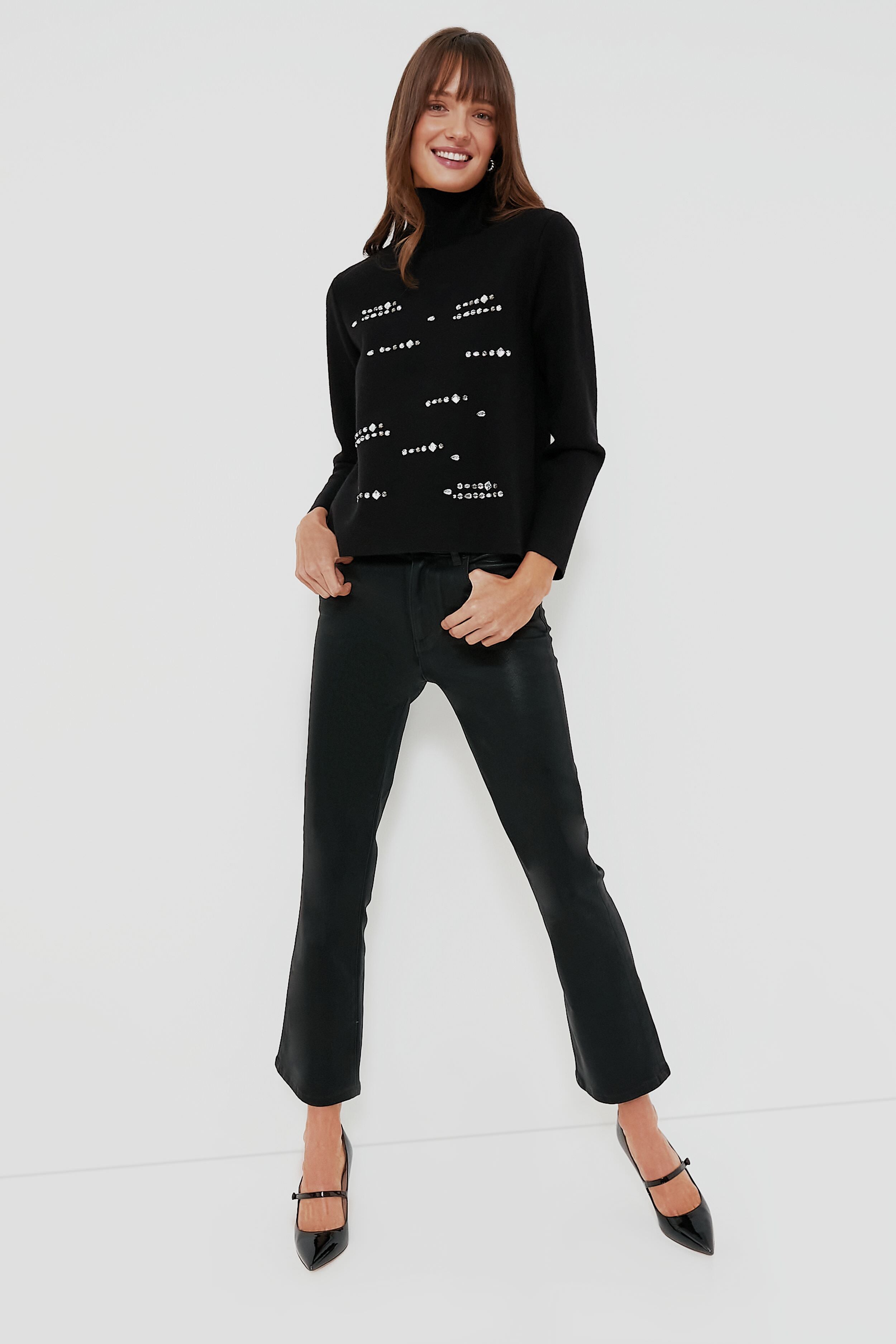 Sweet and sassy. dressed up or down. the options are endless with the Black Embellished Greta Turtleneck. Made with soft midweight luxe knit. this classic slim silhouette plays just as well at a cocktail-formal event as it does grabbing drinks with friends after work. We are pairing this with light denim and boots for daytime and switching to black bottoms and heels for a chic night on the town look.