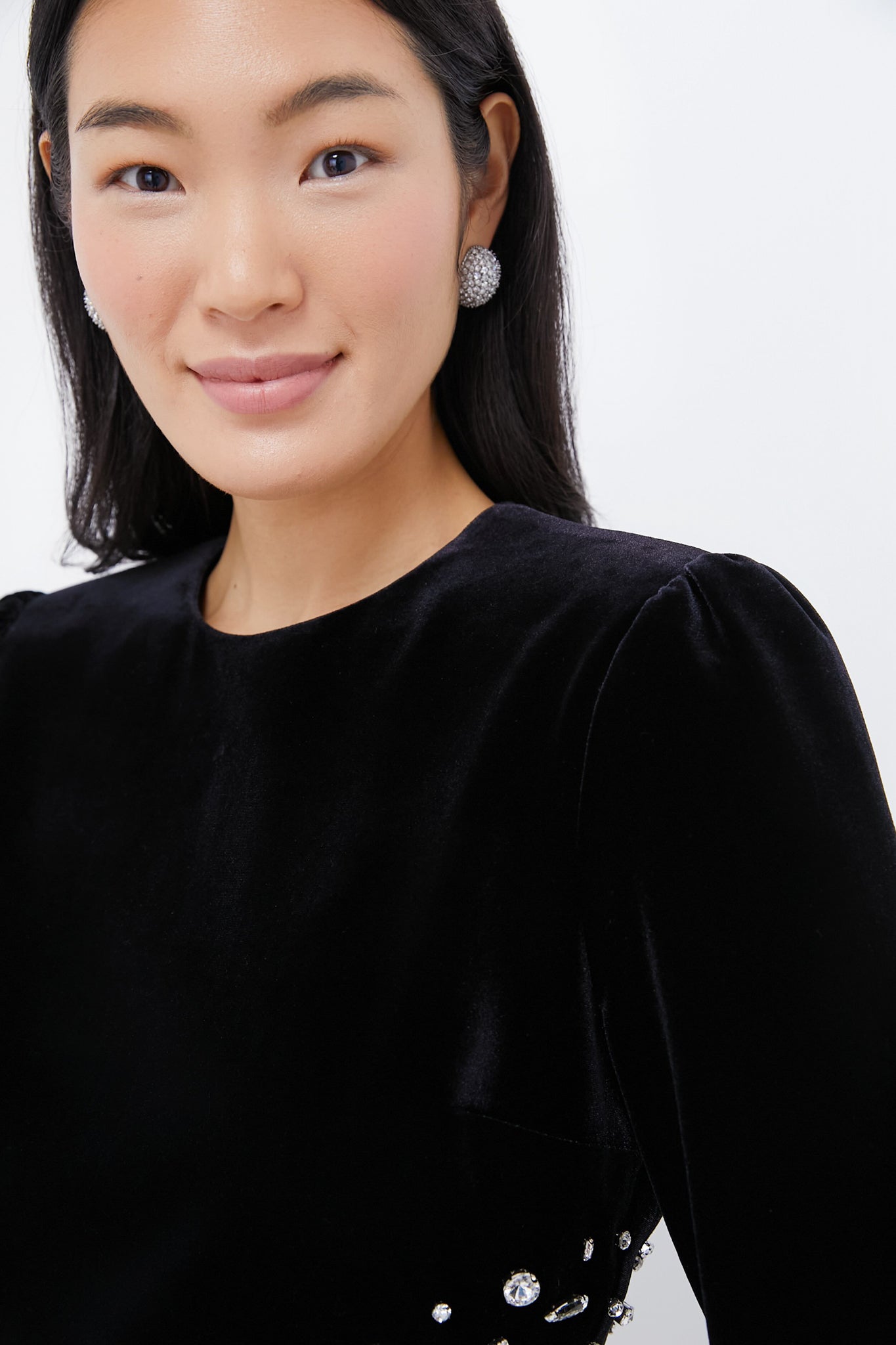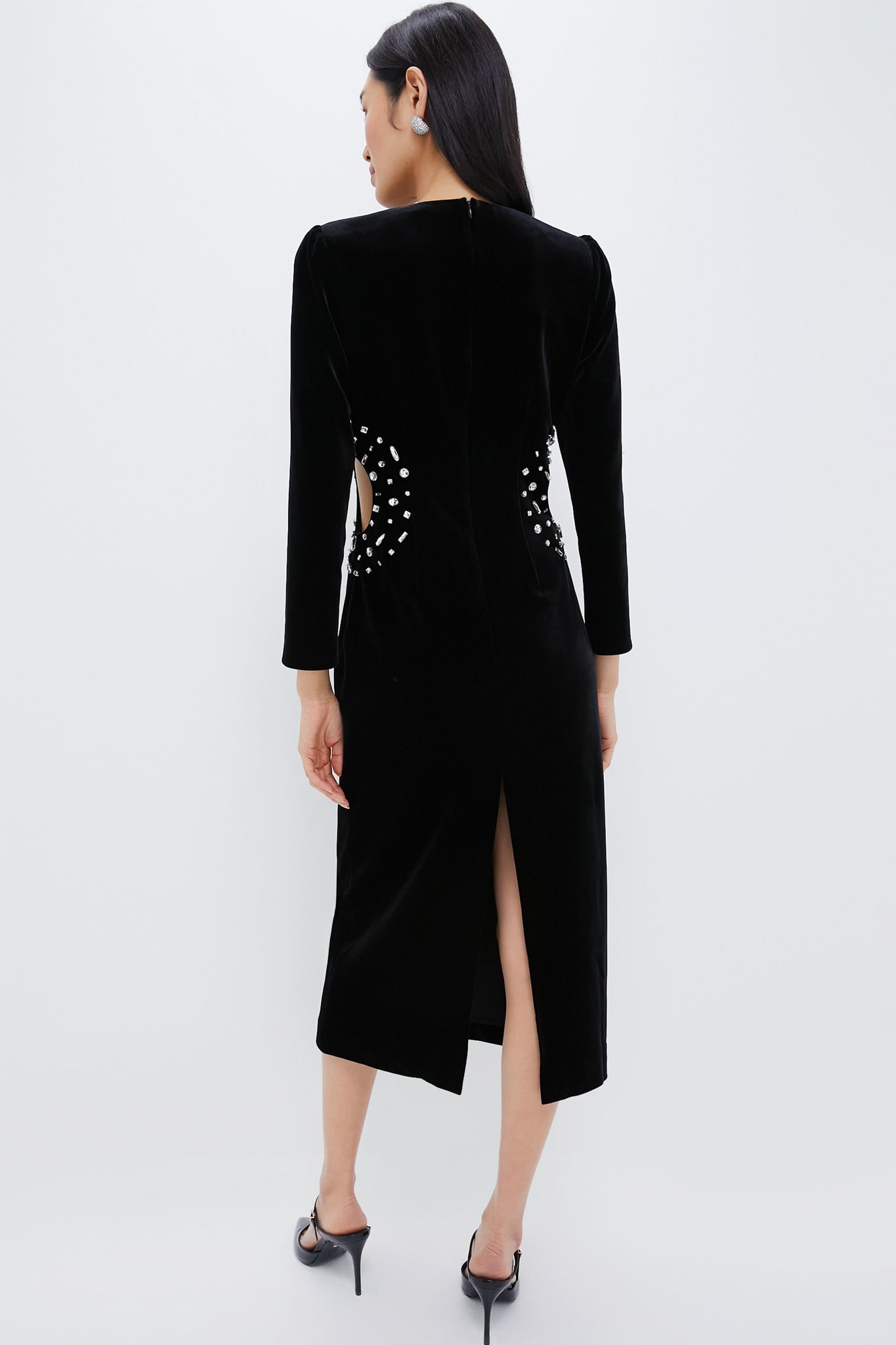 The Jules Midi Dress is a sophisticated pencil silhouette with eye-catching bejeweled cutouts on either side. The subtle puffed shoulders and luxe velvet fabric make this the ultimate look for special occasions- just add silver earrings. heels. and a clutch!