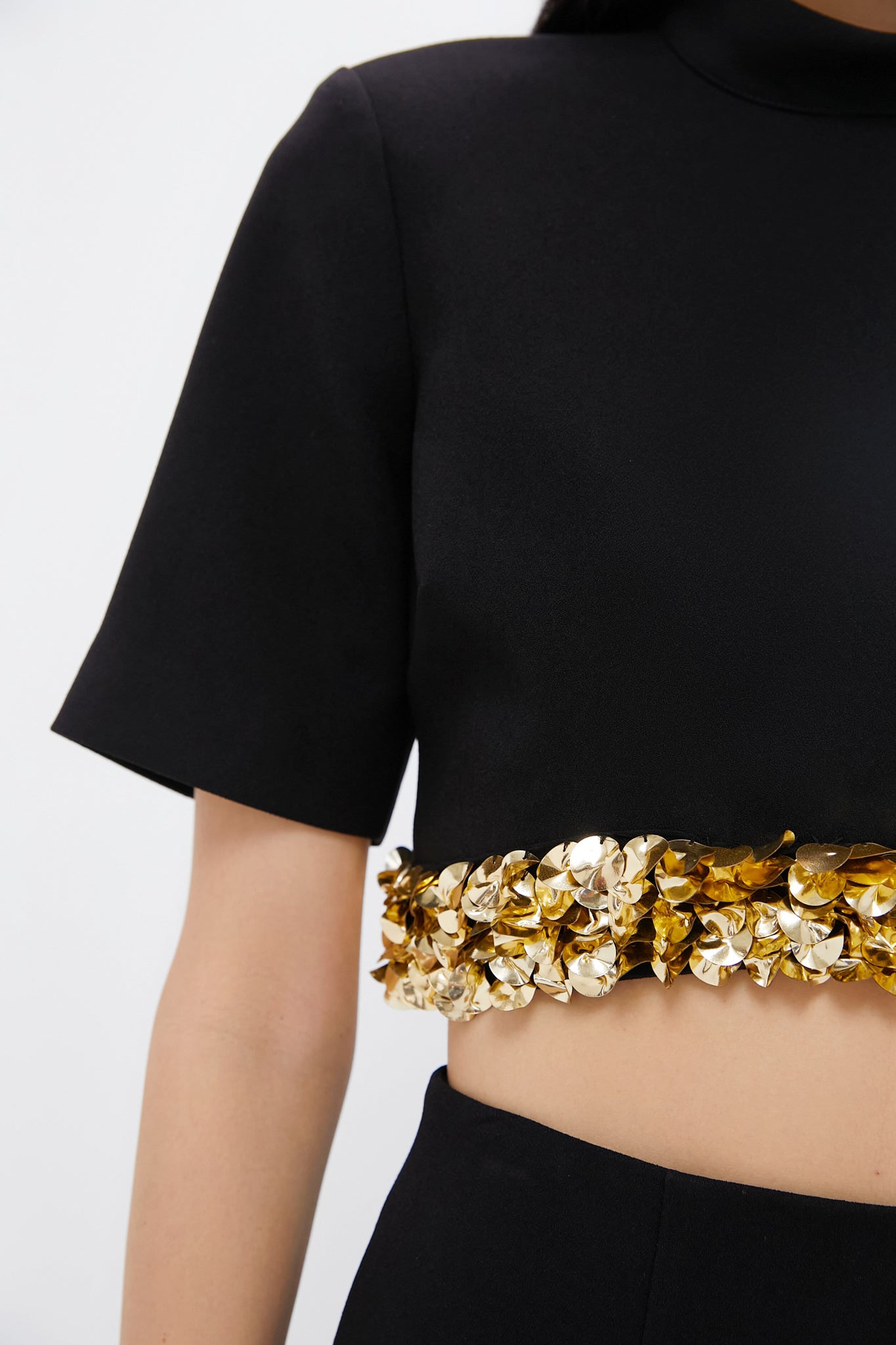 The Jalen Cropped Top a chic party top. Featuring short sleeves. gold embellished detailing. a cropped length. this top is a showstopper. We recommend pairing it with the matching Dua Mini Skirt. a black clutch. and gold heels for the perfect party look!