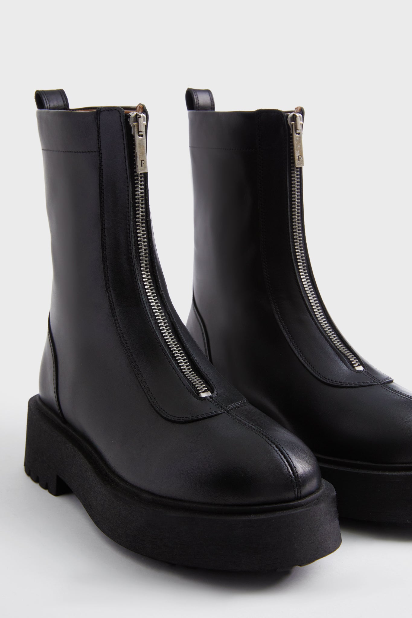 We are back in black with the Leather Alma Boots! Boasting an edgy silhouette complete with a unique front zip closure. these shoes feature a classic round toe. a rear pull tab for easy wearability. and a platform sole for a touch of height that we love. Style with tights and a mini skirt for a sleek evening look. or style with and a cozy sweater and flared denim for off-duty days.
