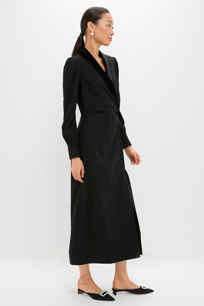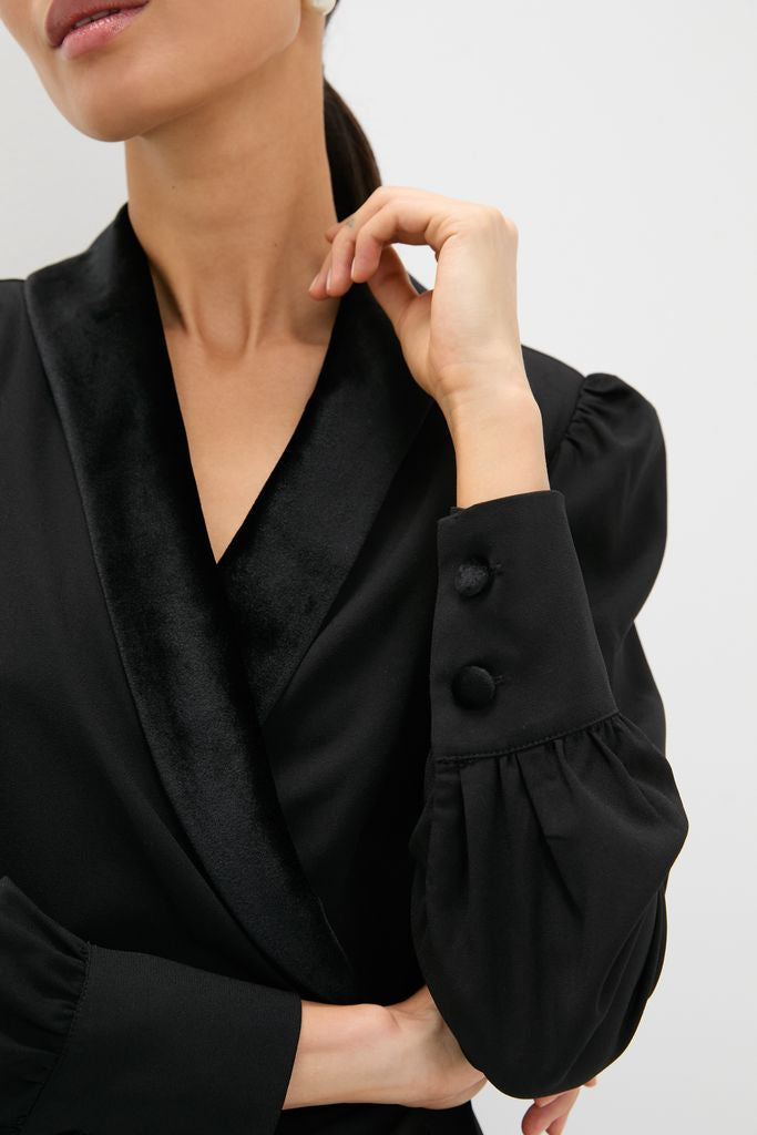 Taking inspiration from a classic blazer. the Mariella dress boasts velvet trim. blouson sleeves. and a side gather detail that leads into a flirty side slit. Style with heels and a clutch for a head-turning look.