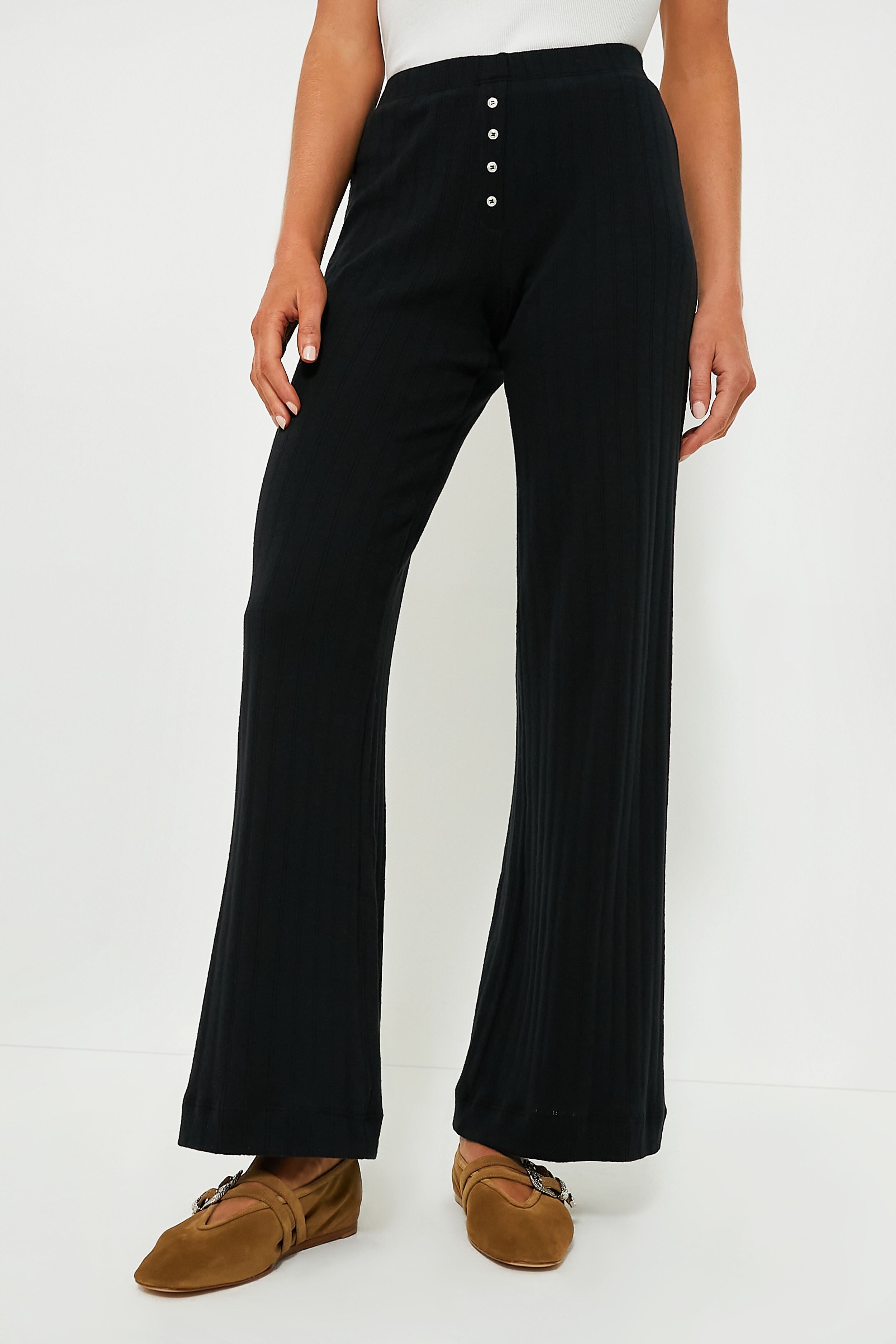 Cozy and chic. the Black Pointelle Boxer Pant is a relaxed. wide leg silhouette. featuring pinhole stripes. dainty eyelets. henley buttons and a comfortable elasticized waistband that sits at the natural waist. From chic airport looks. to lounging around the house on a dreary Sunday. to grocery store runs. pair it with the matching Black Pointelle Classic Crew Cardigan for the perfect girl-on-the-go look all year long.