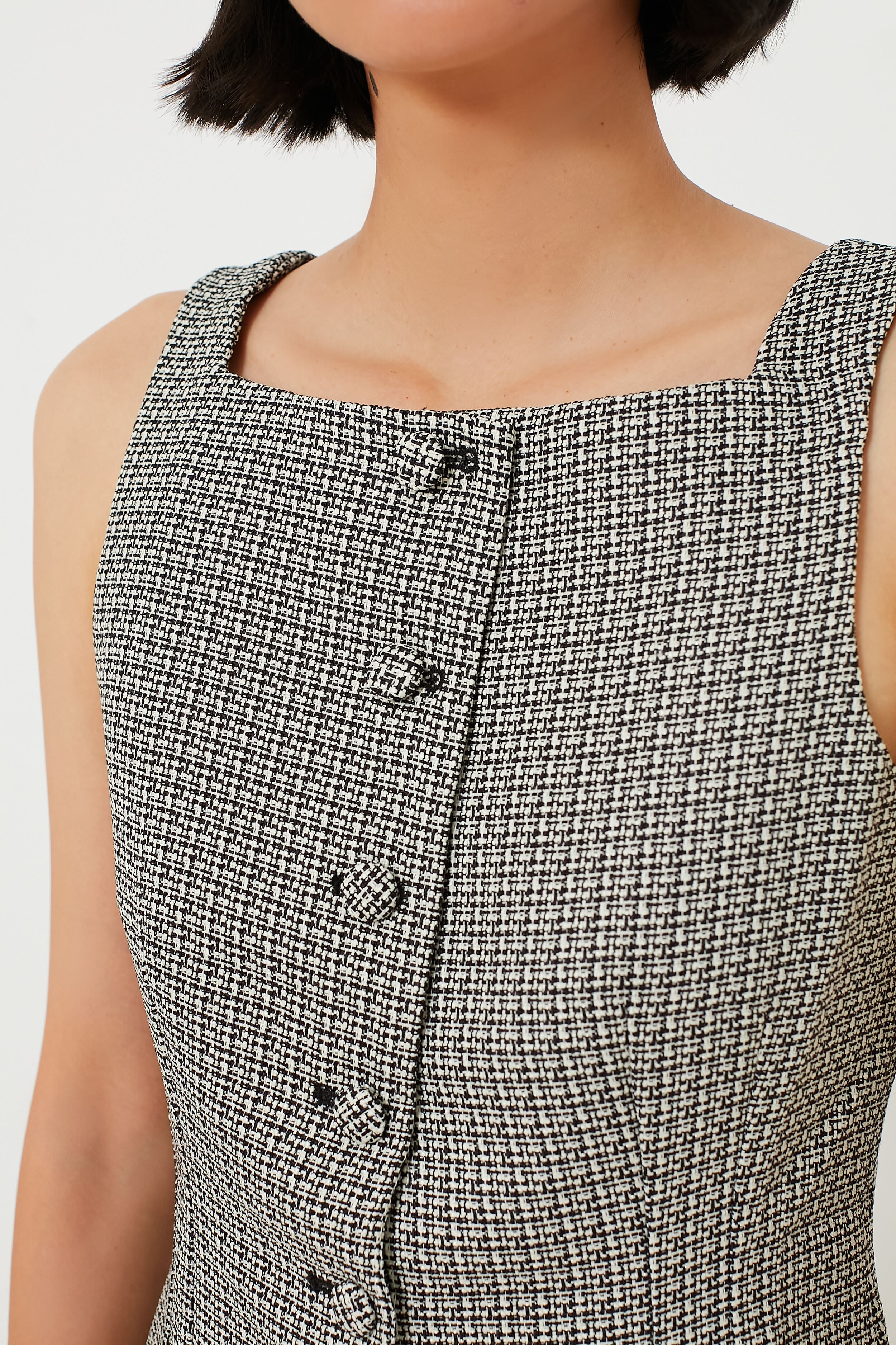 Polished and elevated. the Black Tweed Amira Top is checking all the boxes. Done in a luxe tweed. this fitted sleeveless button down style features a high square neckline with a curved hem and will live in your closet for years to come. Pair with a matching Black Tweed Luz Skirt for a stylish coordinating look. We love wearing it with loafers for office and swap for heels for a dinner date afterwards!