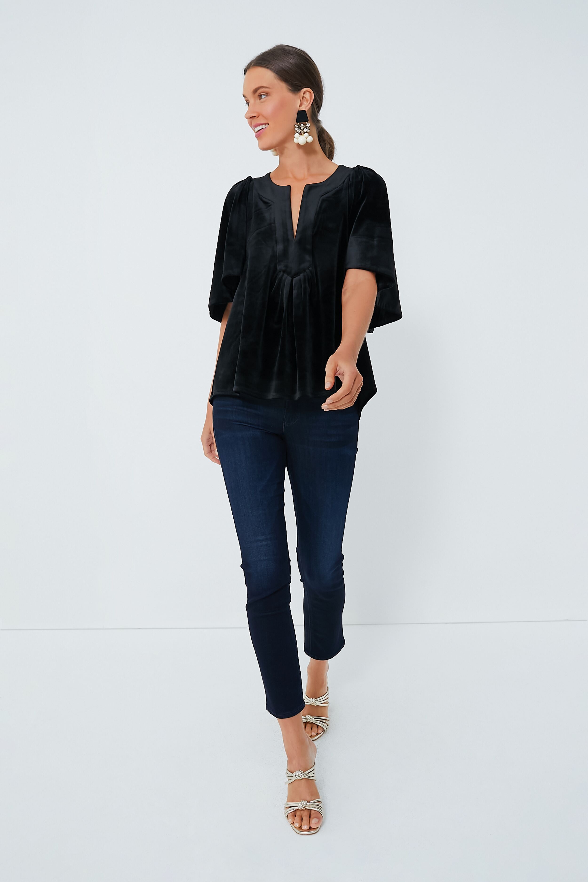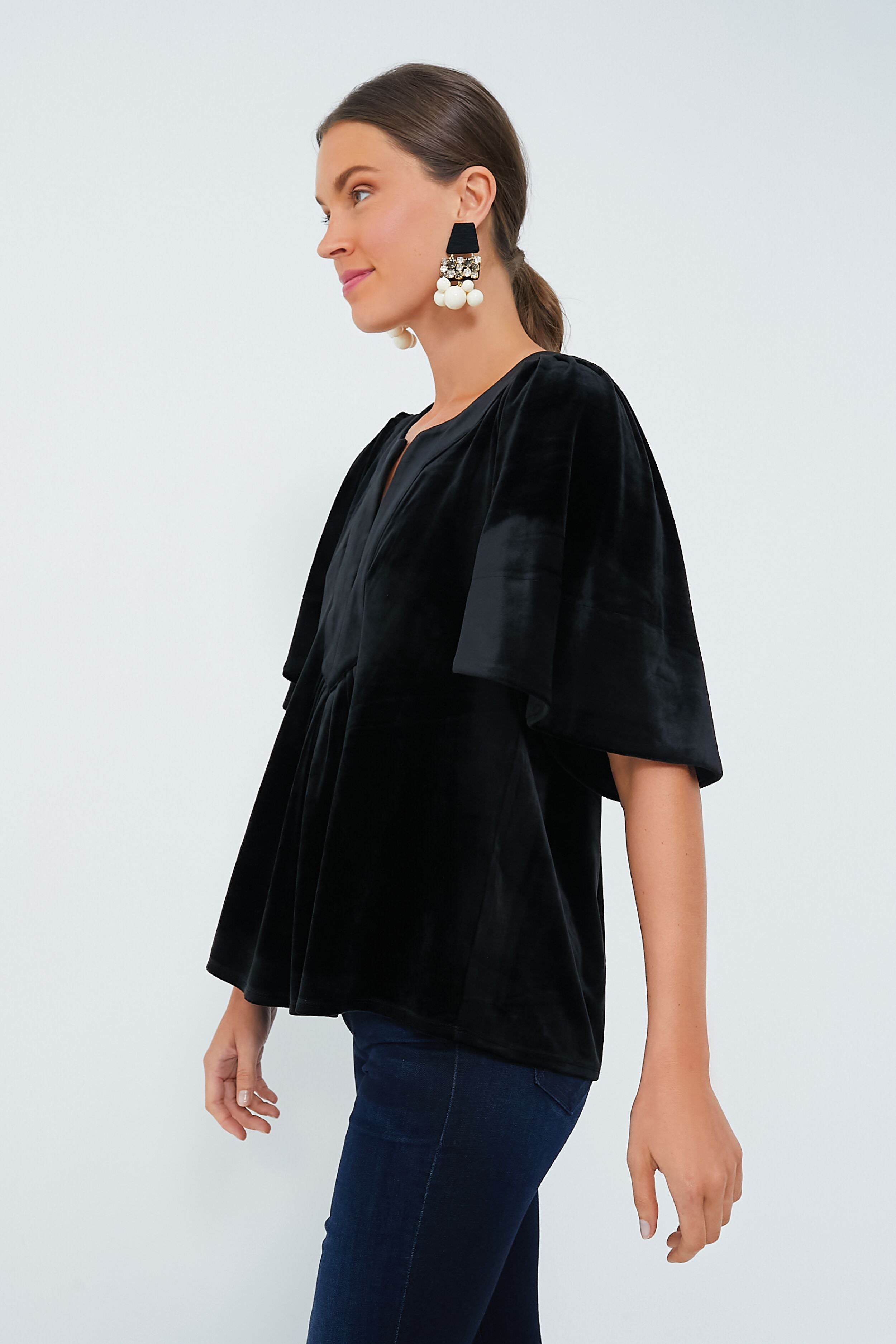 One of our favorite styles. the Finley Top is back in a seasonal velvet! Effortlessly sleek in a classic black colorway. this blouse has a flattering silhouette. oversized flutter sleeves. and a notched neckline. Pair with gold accessories for everything from holiday office parties to dinner get-togethers this season.