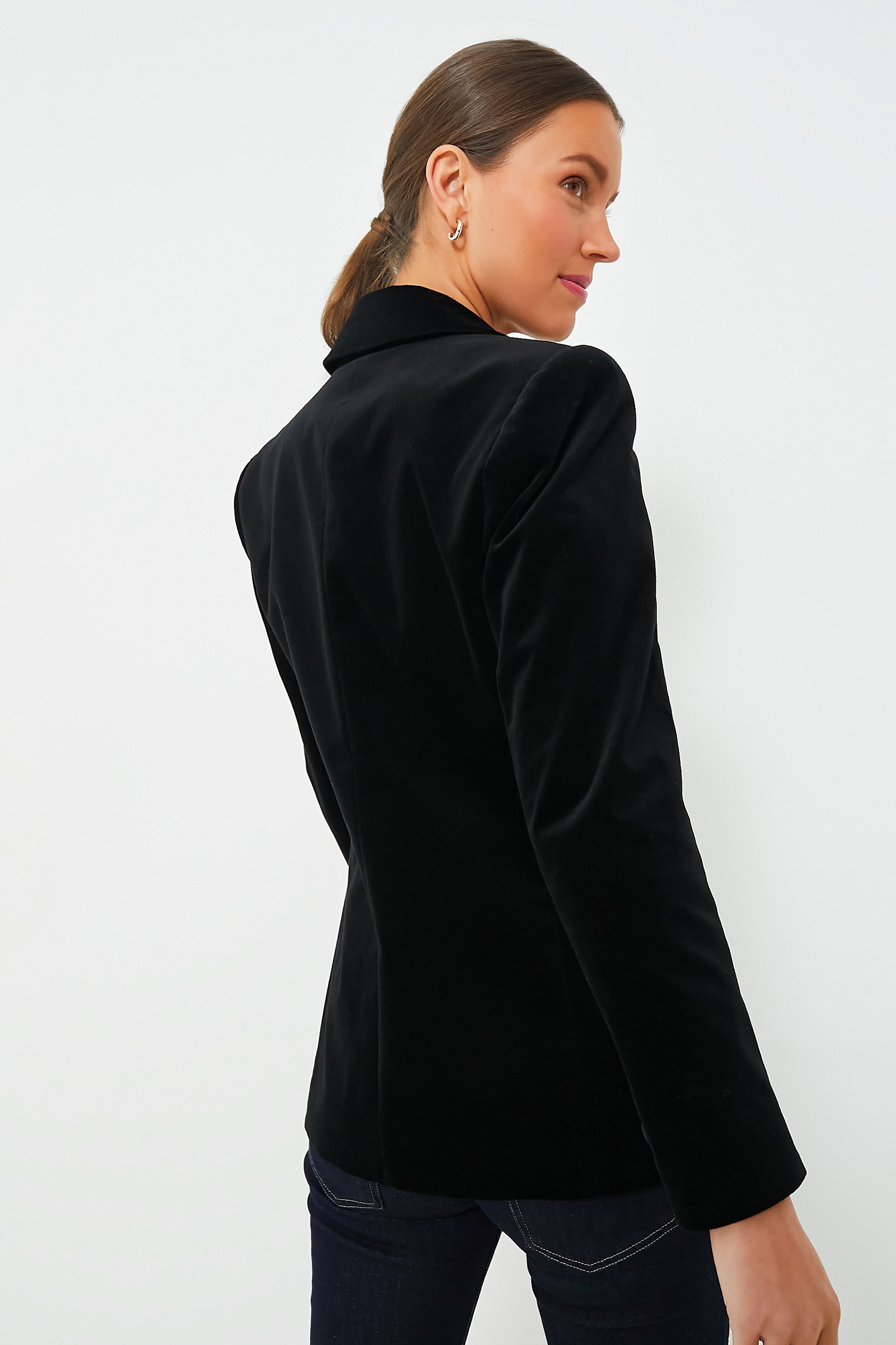 Your new favorite silhouette has just arrived — the Black Velvet Windsor Blazer is the perfect classic. tailored style for completing your closet. Made of a fabulous midweight velvet fabric for a special touch that sets it apart from the average jacket. and finished with luxe details like silk faille buttons and sleek lapels. this piece is effortlessly elevated. Style it with denim and heels for evening. with matching velvet pants for a festive feel. or over a dress to shake up your look.
