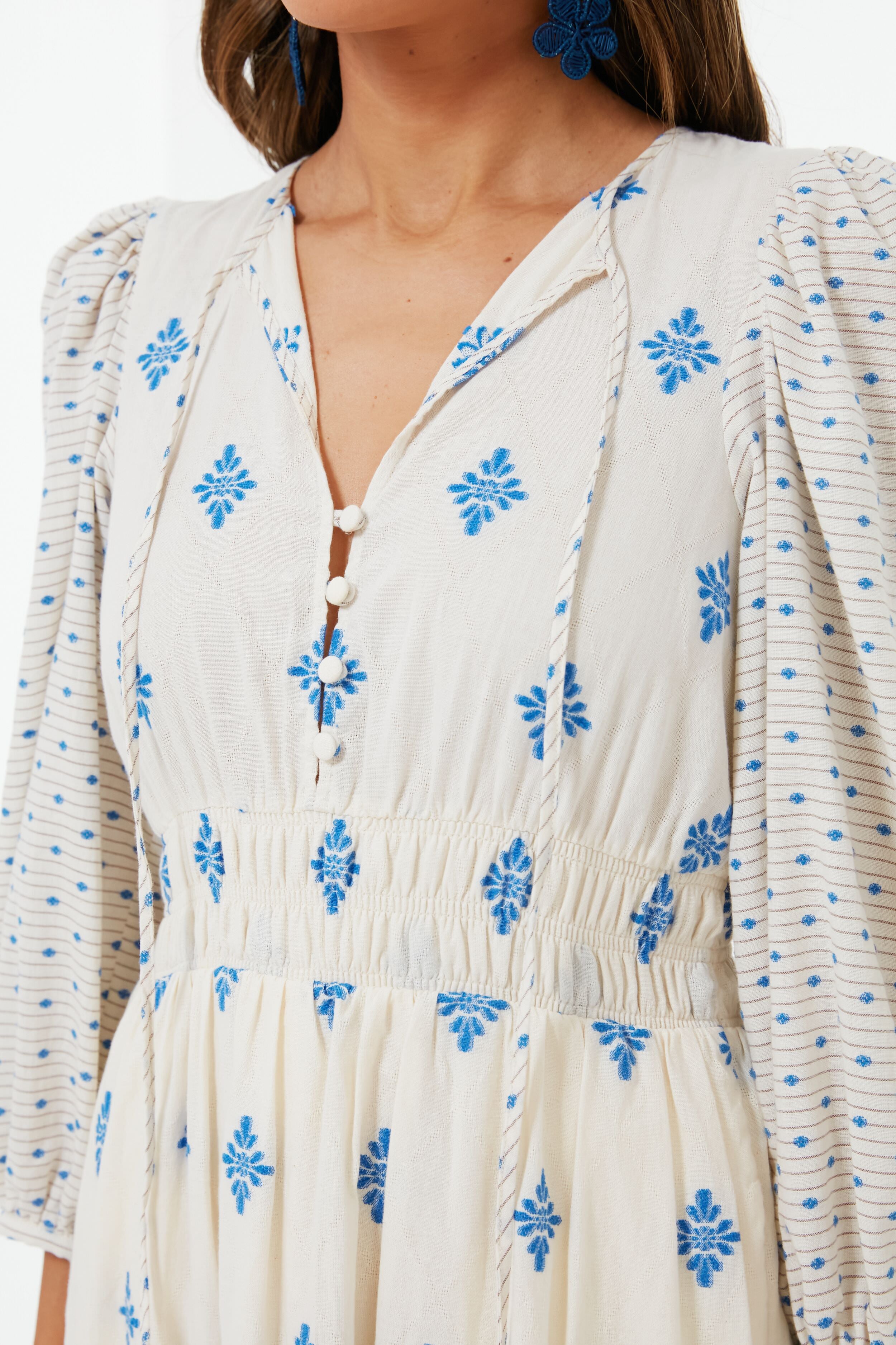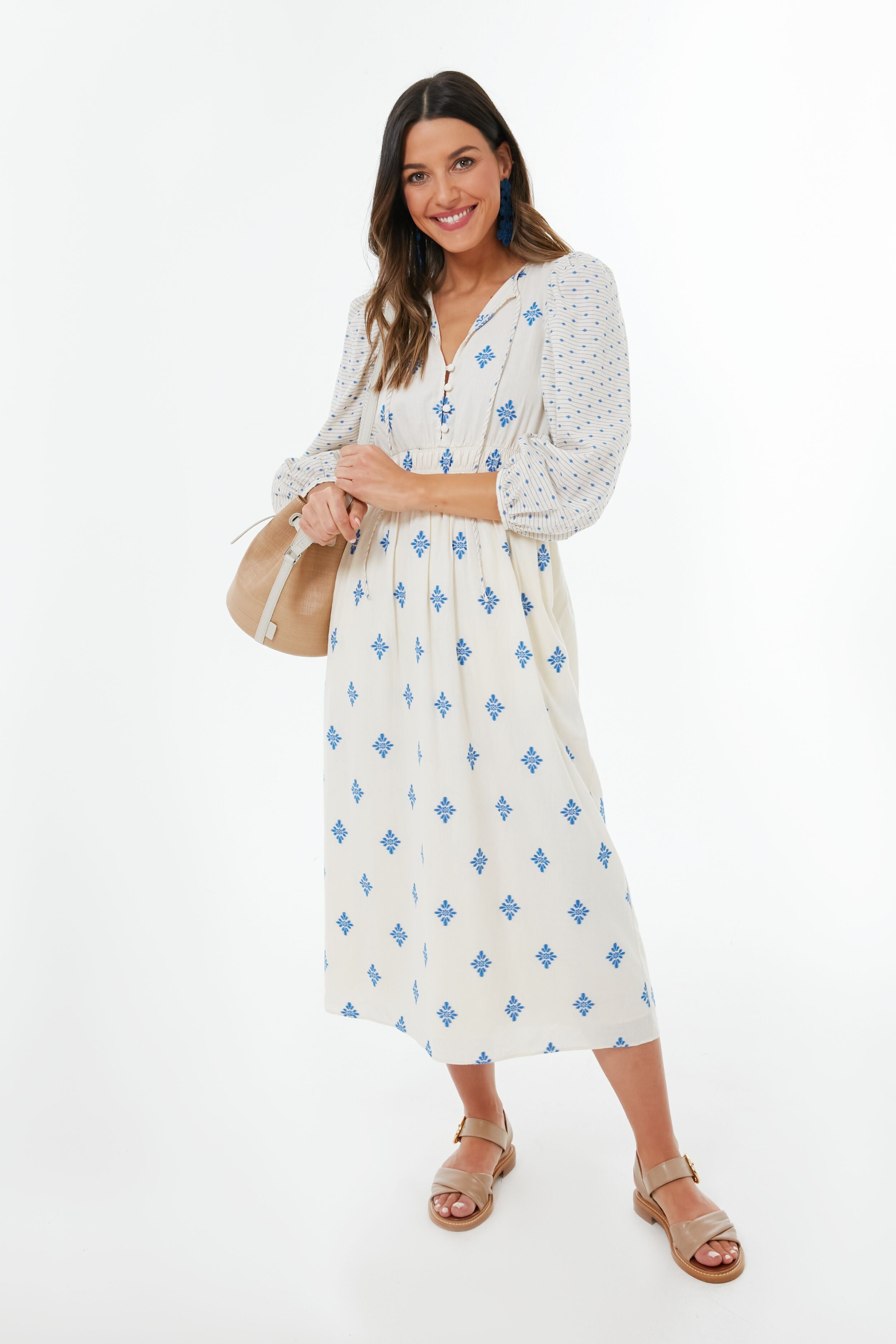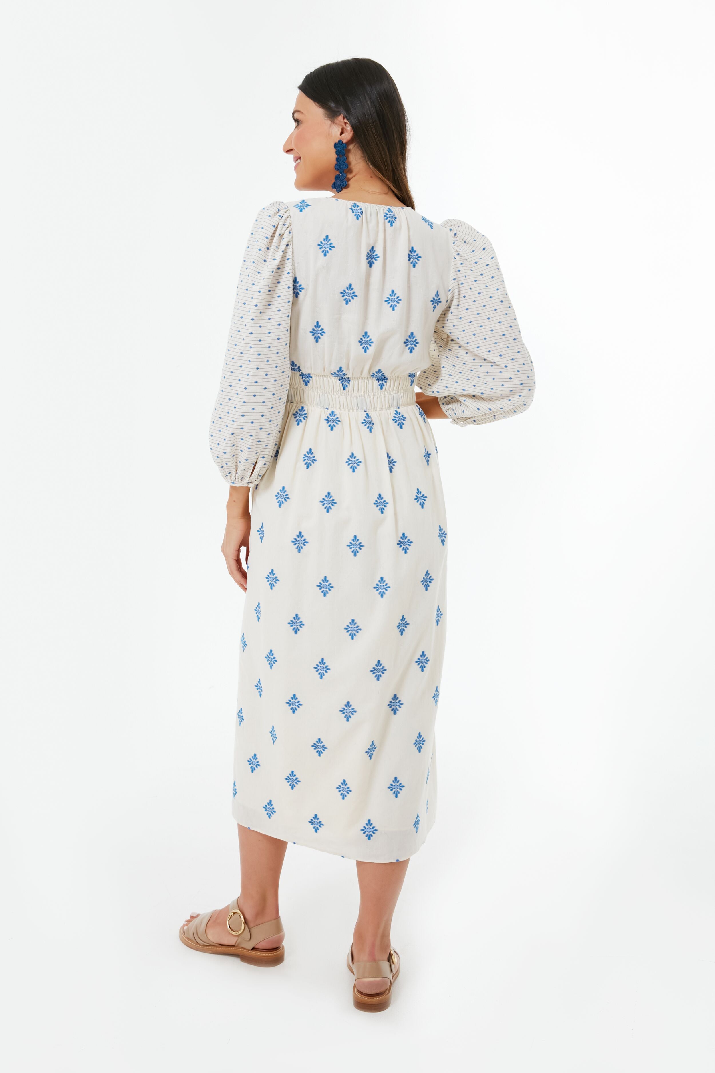 The epitome of refined resort fashion. the Blue Medallion Clementine Dress combines a hint of boho style with a breezy cotton composition that is perfect for sunny getaways. Featuring all kinds of special details such as covered buttons that run down the bodice. puffed shoulders. and a shirred waist. this romantic midi is sure to become a favorite. Versatile enough to earn it a space in even the smallest of travel bags. it can be dressed up with espadrilles and a clutch for dinner and drinks. or dressed down to see the sites with white sneakers and sunglasses.