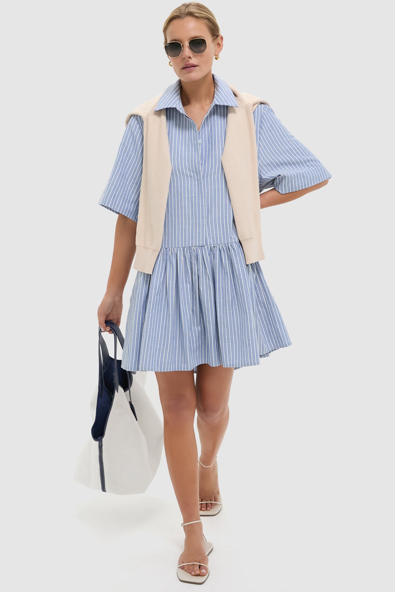 The Blue Stripe Piper Shirt Dress is a cool-girl take on a classic style. With wide half-length sleeves. a gathered skirt. and a relaxed A-line silhouette. this breezy mini is perfect for pairing with everything from sneakers. to sandals. to flats!