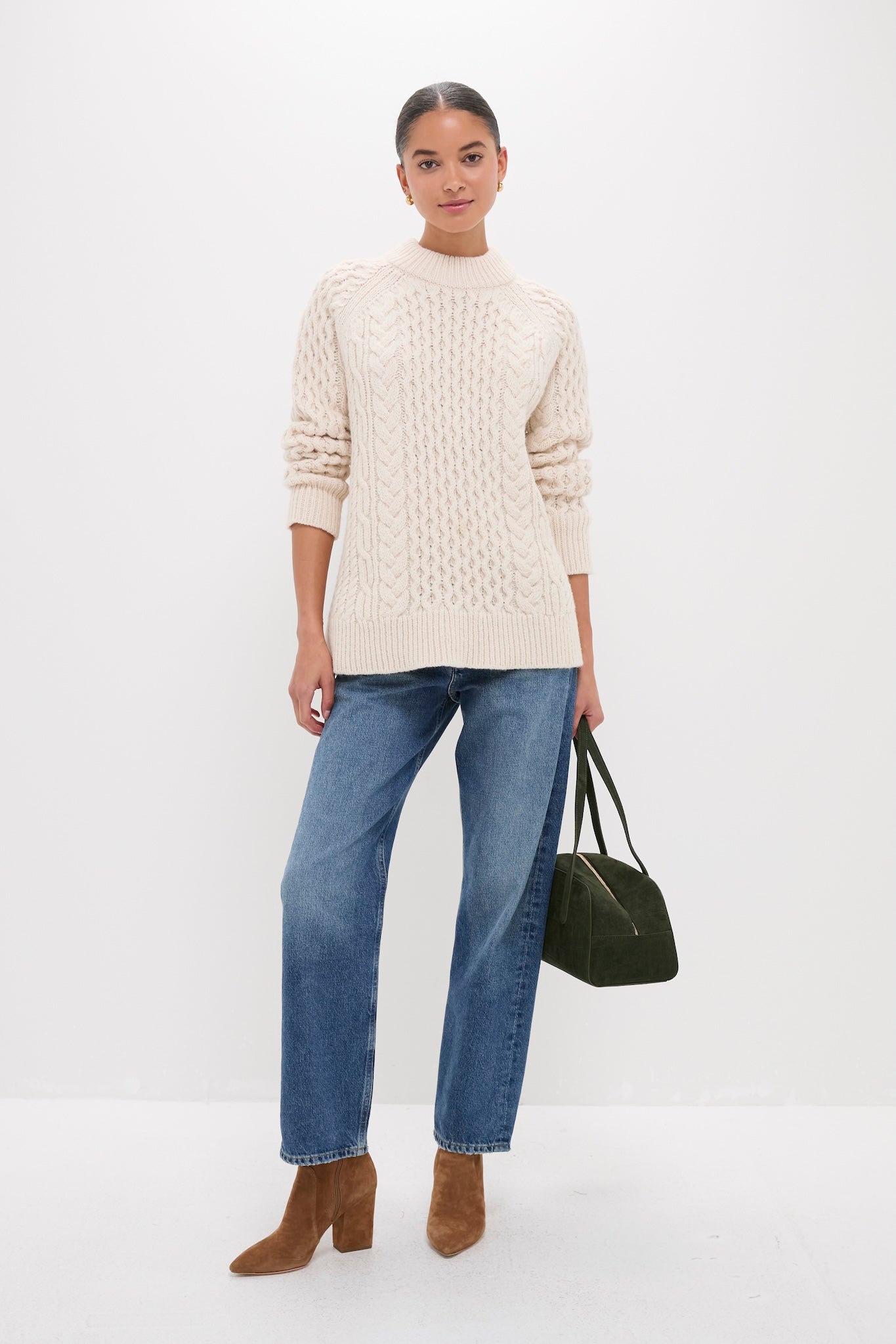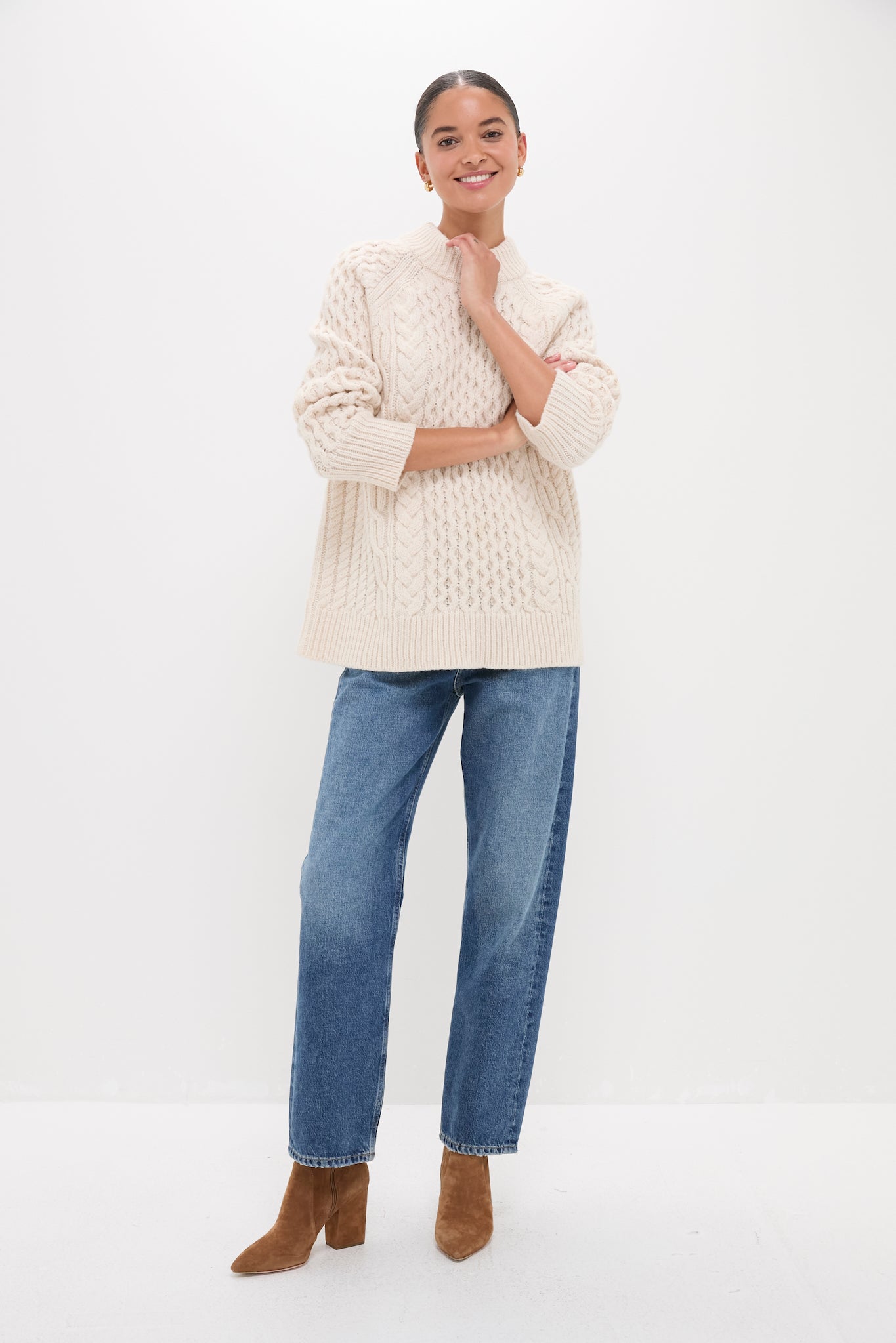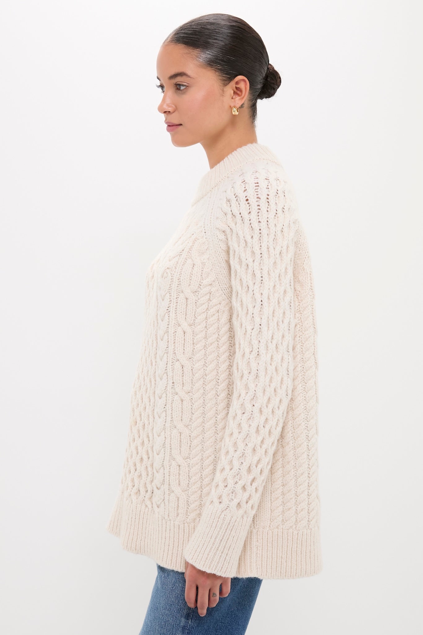 The Ivory Galway Fisherman Sweater features classic cable-knit stitching. a relaxed fit. and ribbed trim for timeless texture and warmth. Perfect for chilly days. style it with denim. leather trousers. or layered over dresses for effortlessly chic comfort.