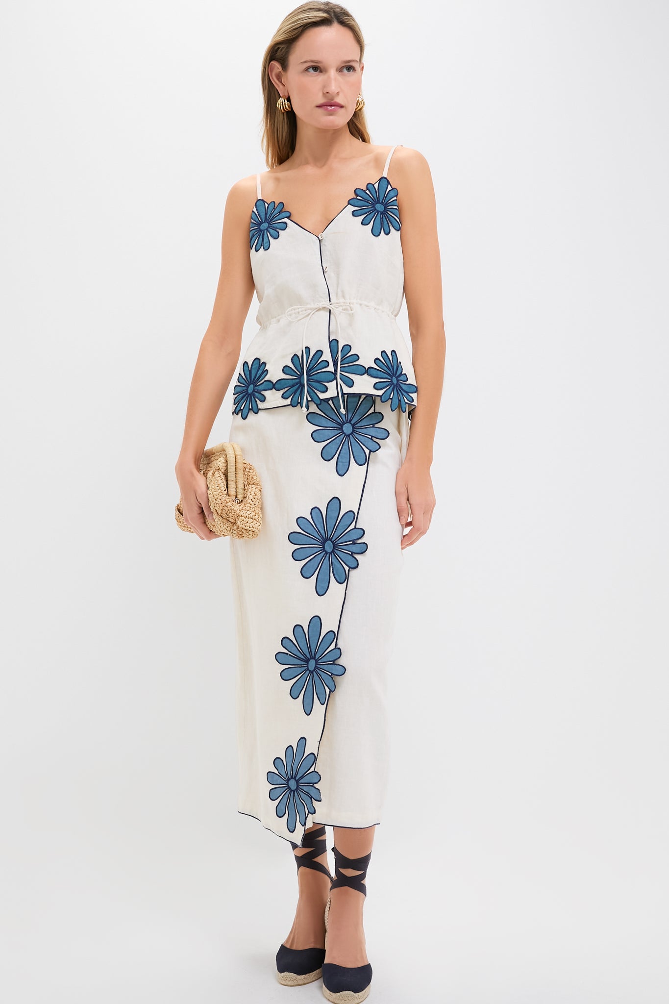 Featuring a high rise fit. self-tie side detail. and hand-applique florals. this midi is the perfect way to spice up any outfit. Lightweight and breathable. it's made of breezy cotton for sunny days — pair it with a tank. sandals. and sunnies for brunches. or dress it up with the matching Ivory Flowers Pam Top. wedges. and gold jewelry for dinners al fresco.