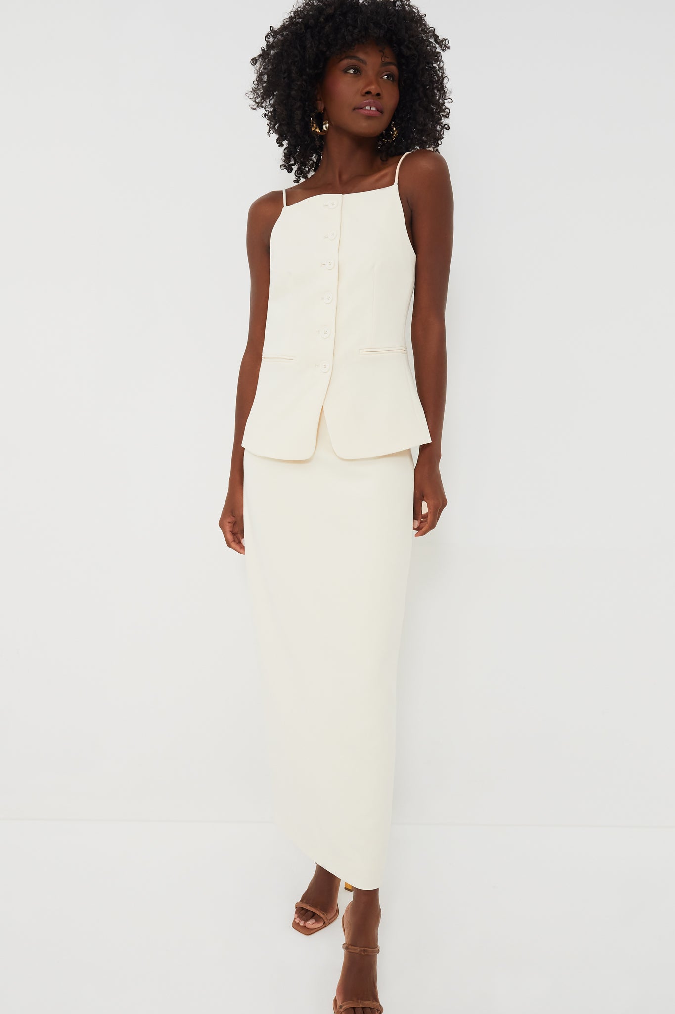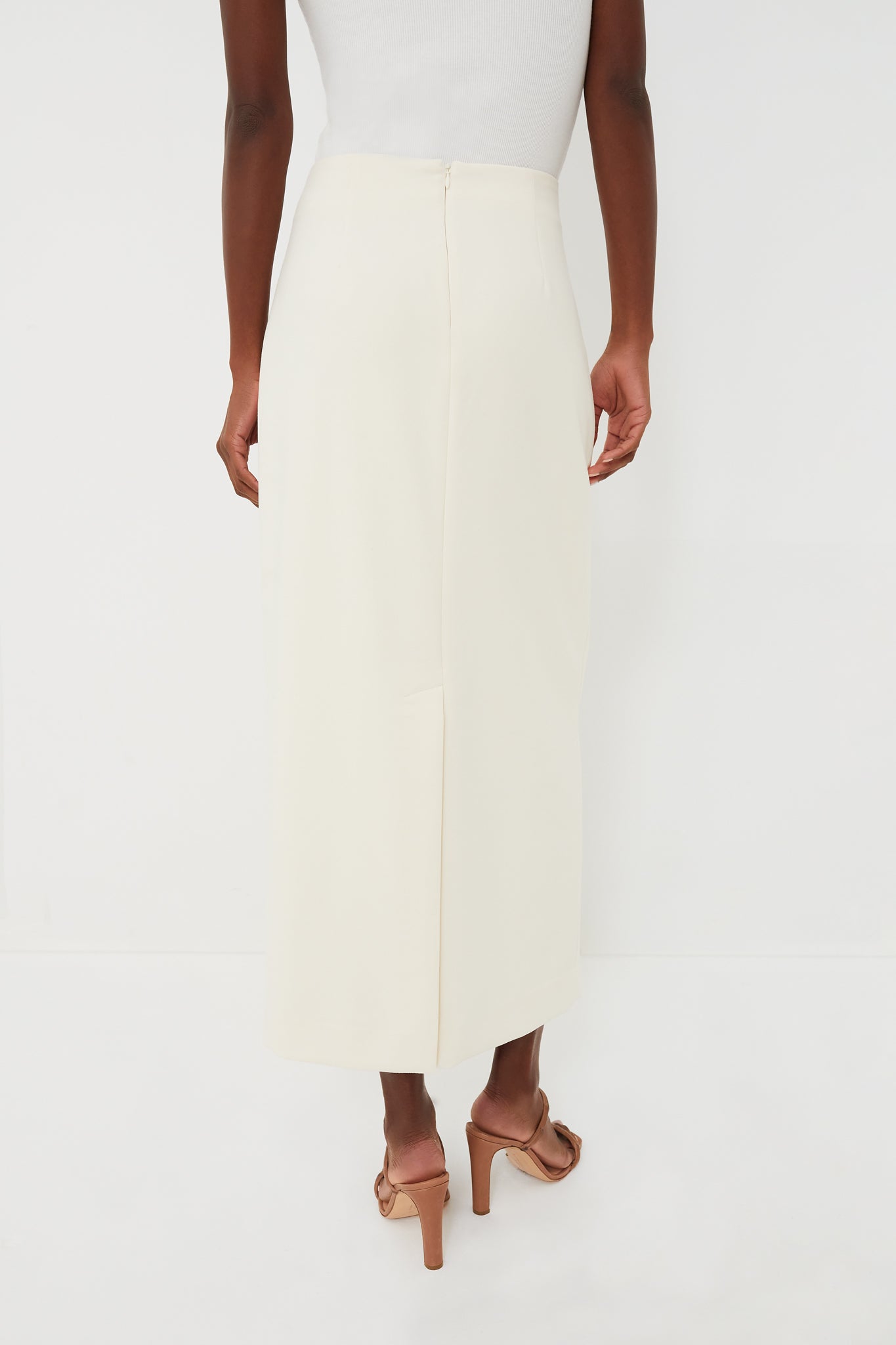 The Ivory Smith Skirt is the epitome of effortless elegance. A tailored column skirt. this style features a midi length. double welt pocket details. and a back slit. Elevated and chic. we are pairing this with the matching Ivory Una Top and heels for a standout set.