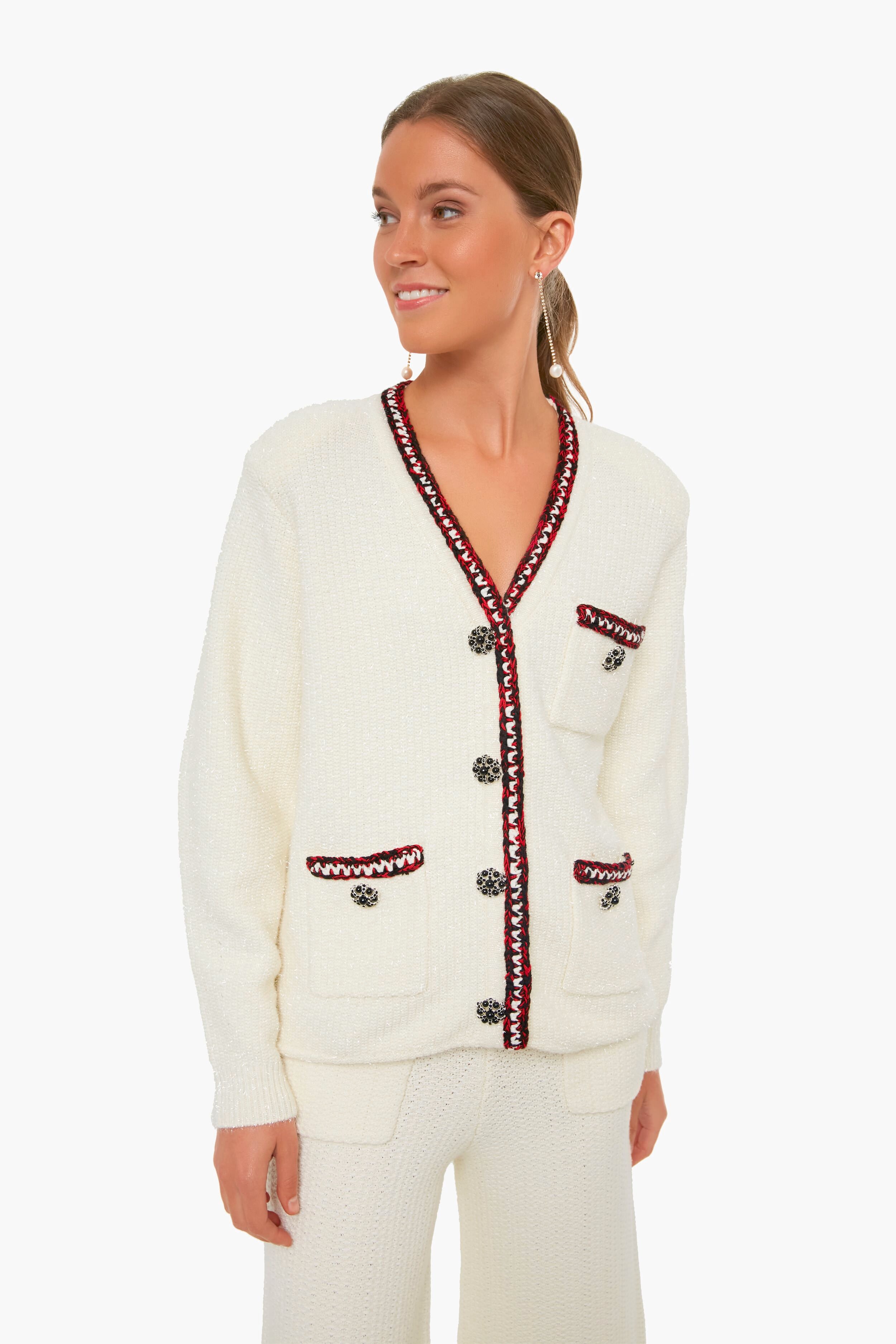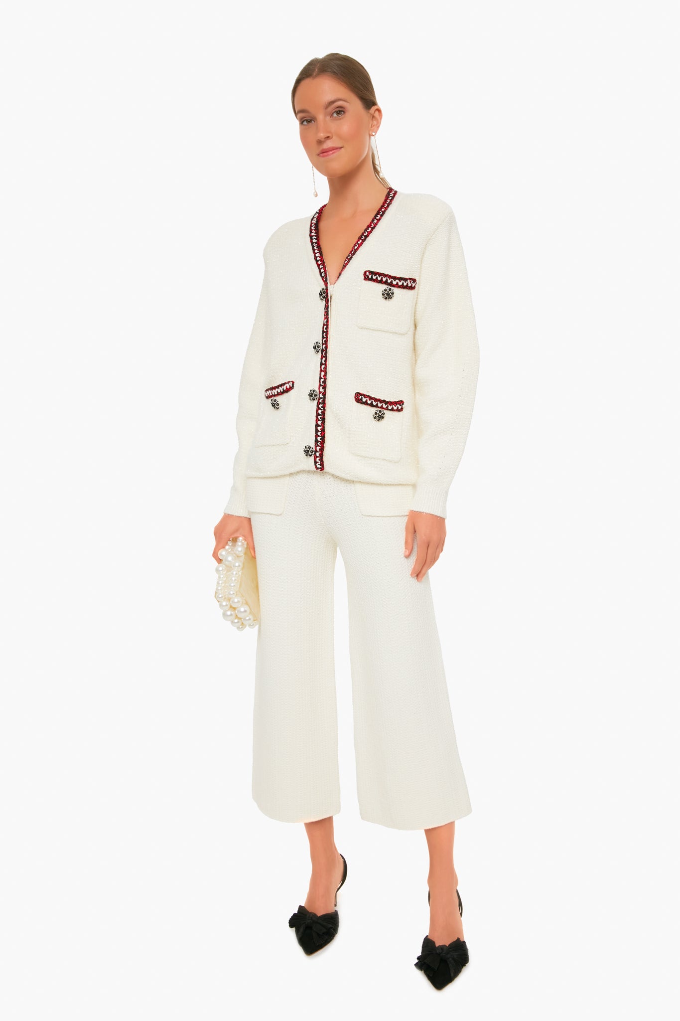 The Ivory Waffle Knit Trouser features a high rise fit. front patch pockets. diamante buttons. and bouclè trim. Forever classic and always chic. pair this style with the matching sweater for a retro. Parisian-inspired look.