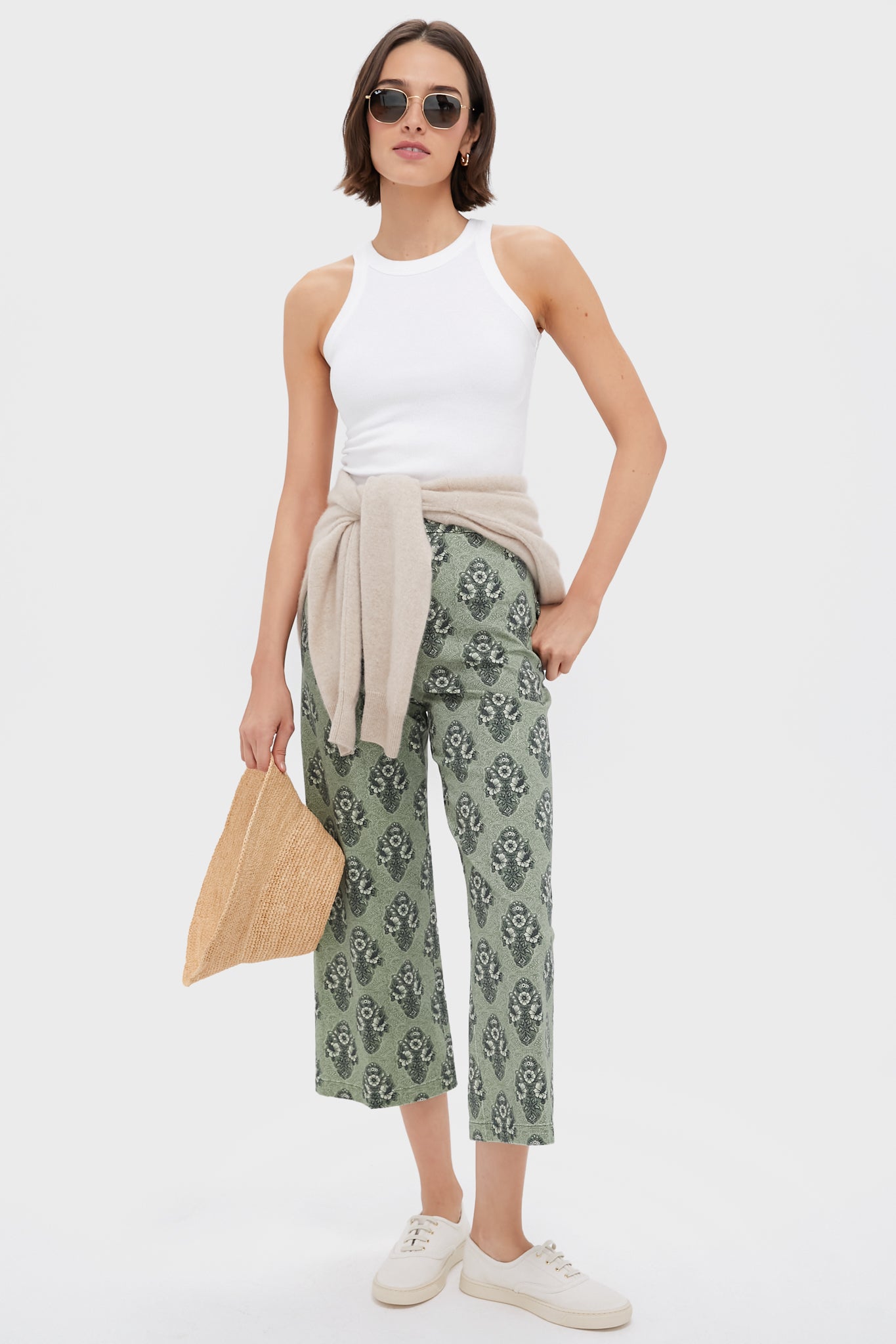 This clean silhouette boasts a wide waistband with a zip fly and button closure. back slit pockets. and a stylish wide cuff. The chintzy floral print features green hues that are oh-so-classic. Pair with sneakers and a tank for casual weekend days. or dress up with a crisp blouse and flats!