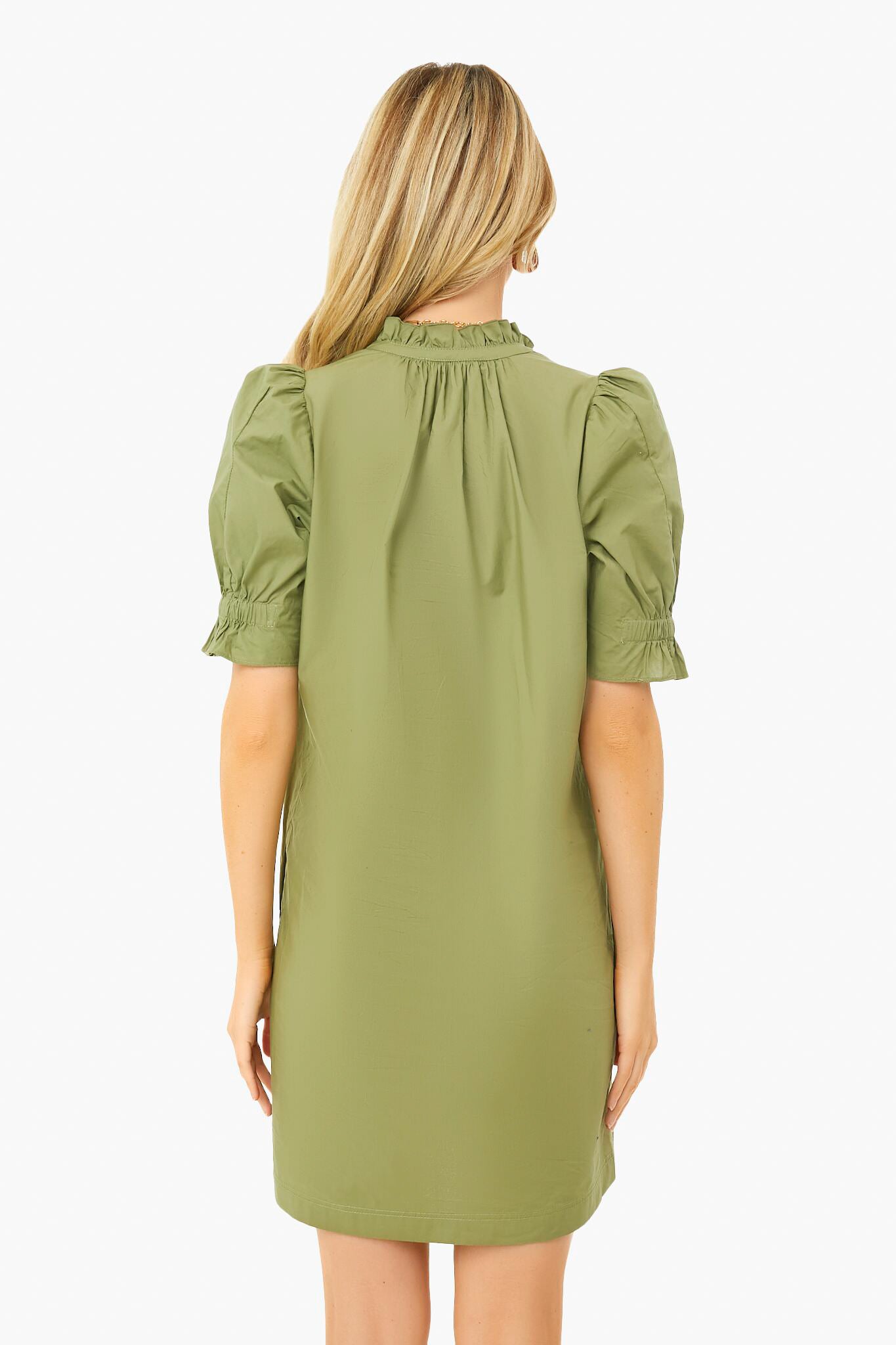 Featuring a puff shoulder detailing and a ruffled collar. the Sabina Dress is a simple statement piece that's necessary in every wardrobe. Snap buttons accent this relaxed. popover silhouette. Pair with sandals and gold jewelry for an effortlessly chic look.