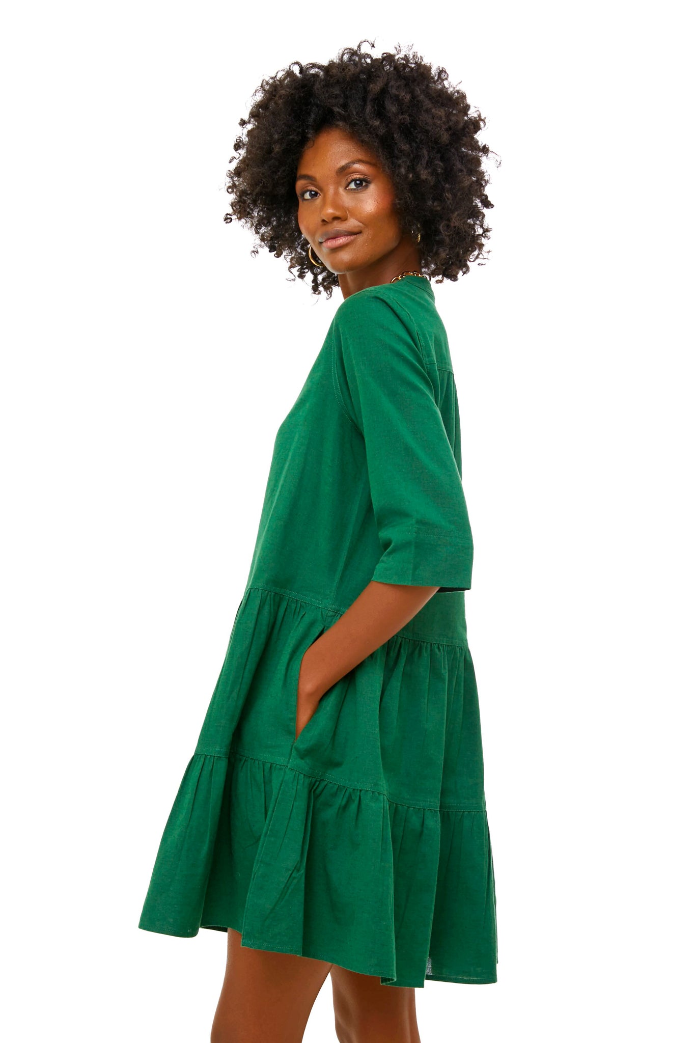 The Jadeite Maurino Mini is a new silhouette made from a breezy linen-cotton twill fabric. Utility meets femininity with this style's drop waist tiered skirt. half button placket. and banded collar. Pair with wedges and gold jewelry for an elevated and effortless brunch look.