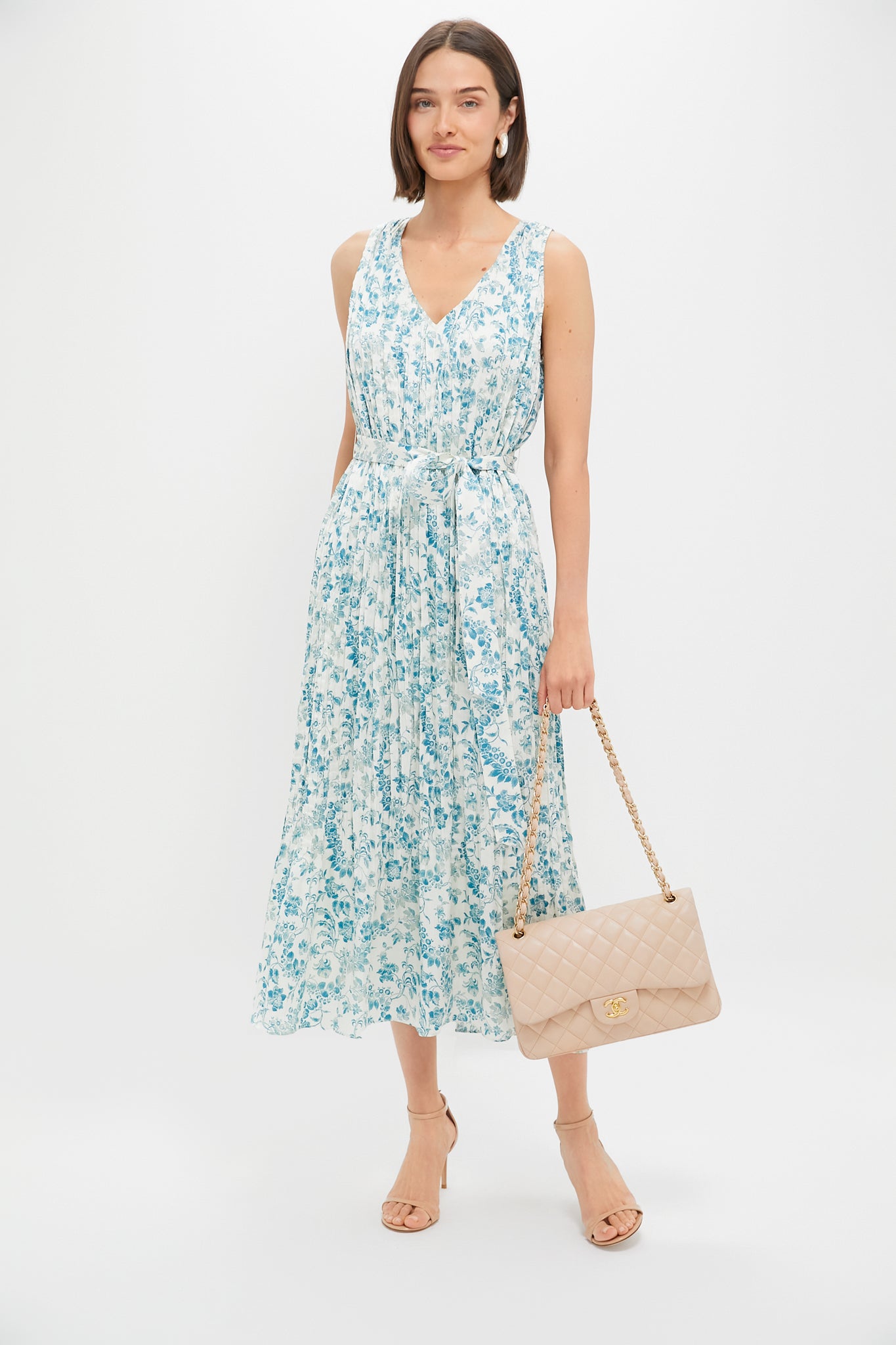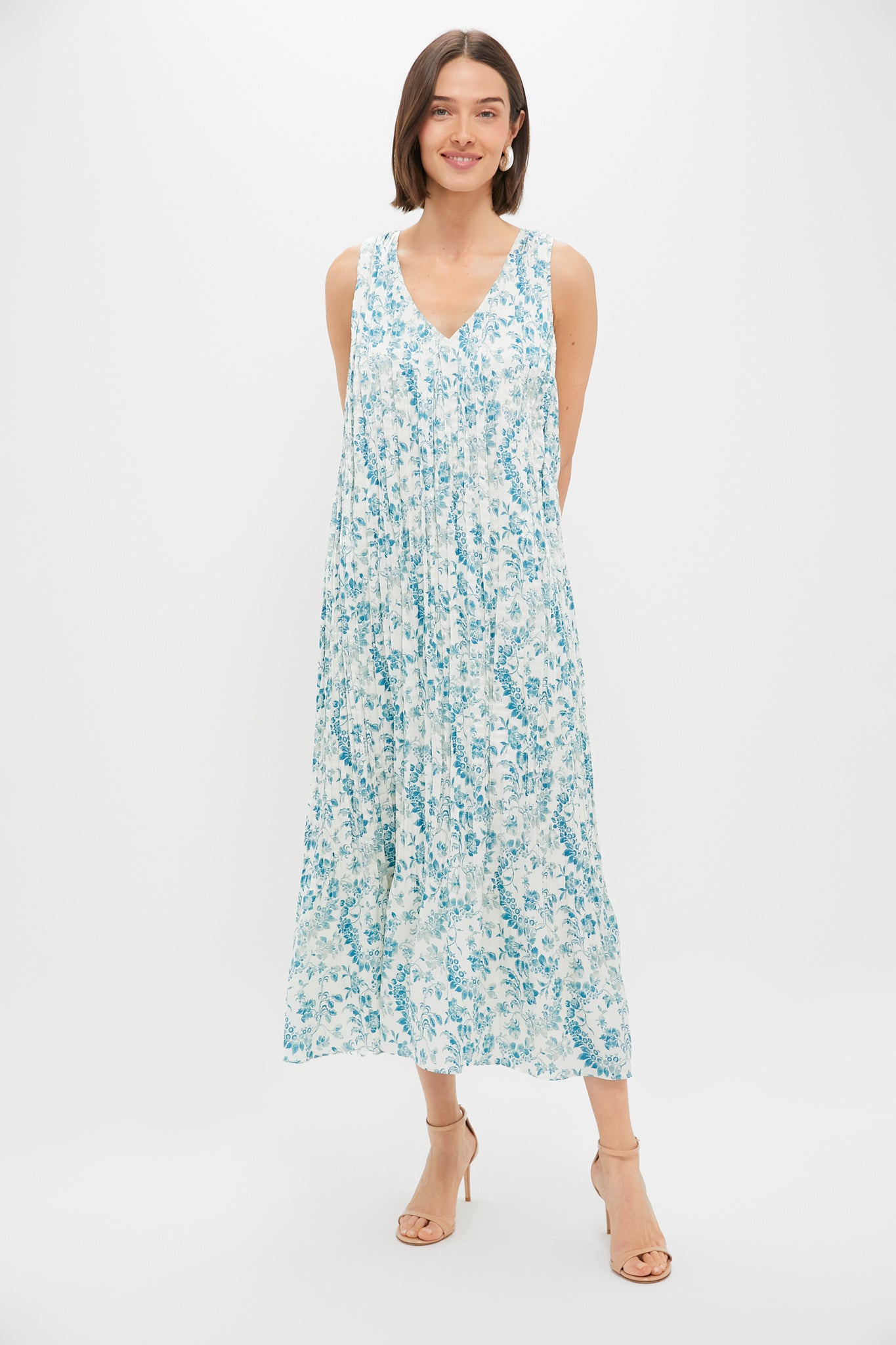 The Jardin De Fleurs Plisse Crinkle Alina Dress features a playful blue floral pattern and pleated details. This ultra feminine style is midi length with a self-tie belt. Perfect from brunches. showers. and other celebratory occasions. just add heels and a clutch for chic style!