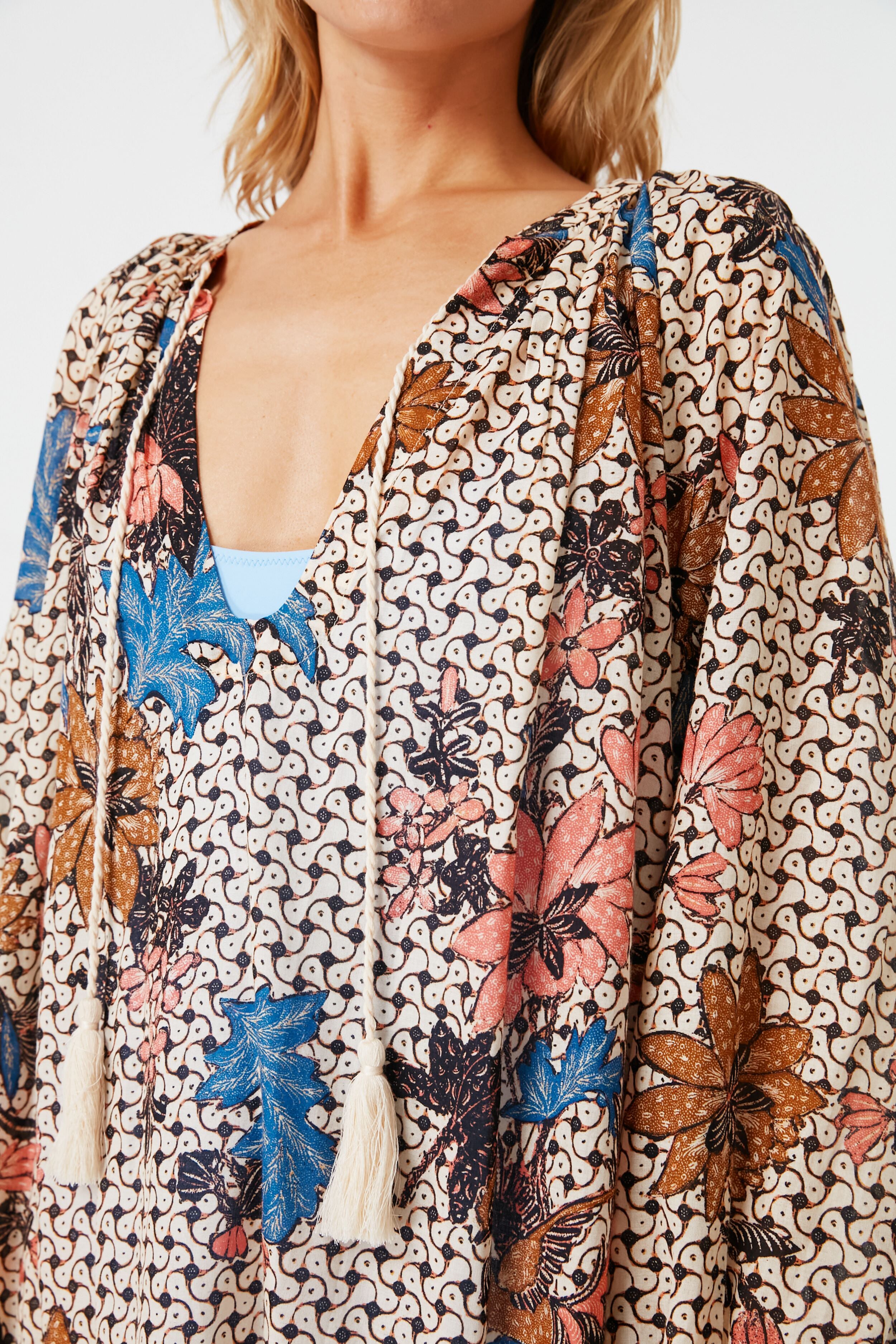 Adorned with funky. geometric florals. the Jasmine Biarrtiz Tunic is the perfect "I'm on vacation. do not disturb" look. Cut from an airy and light cotton blend. this breezy number features voluminous sleeves and tassel ties that are full of beachy bohemian charm. Wear from sunrise to sunset. beach to bar. with sunglasses or sandals—trust us. this silhouette can do it all.