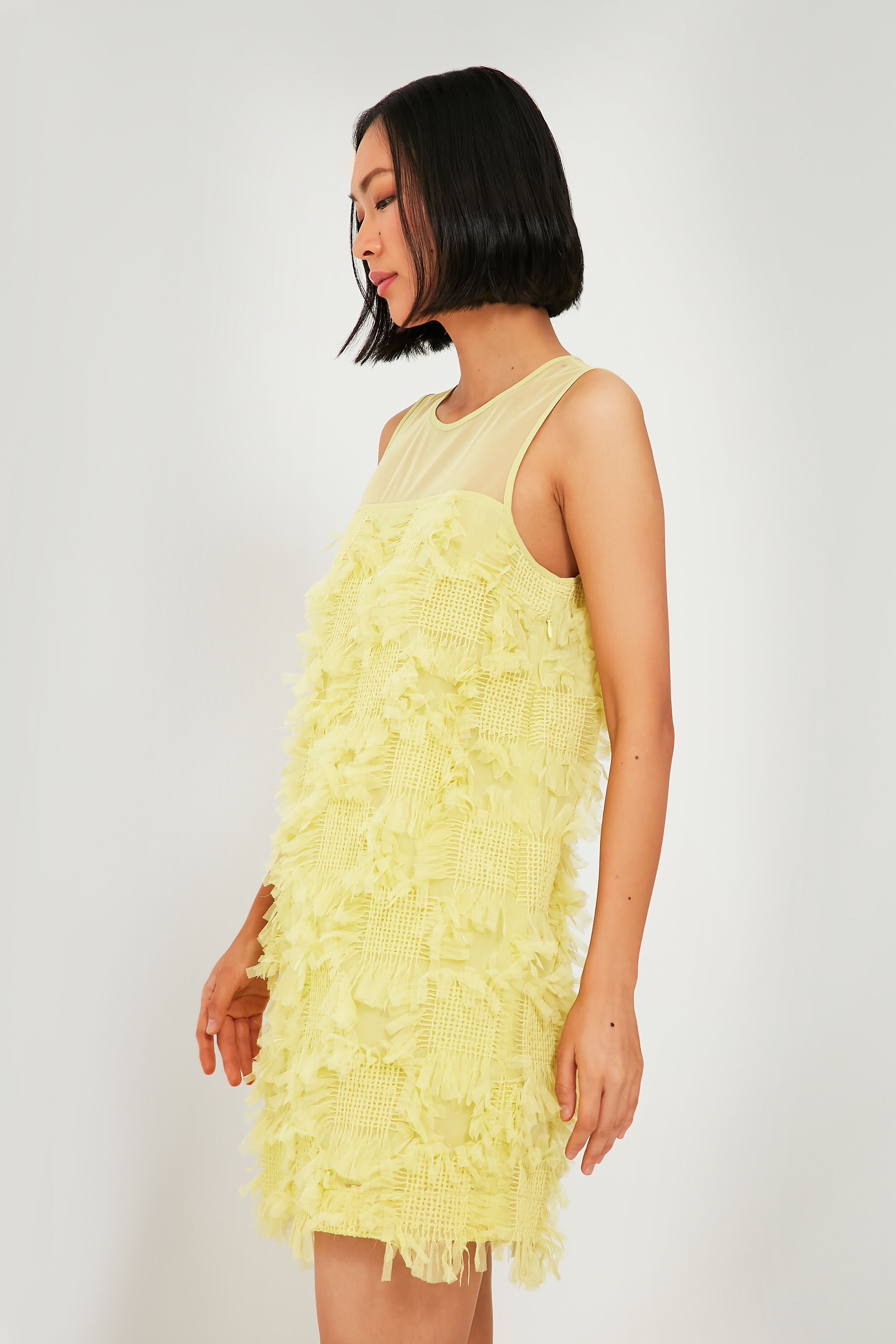 A sweet sheath with plenty of attitude to boot. we are really into the Jaune Yellow Alizeh Dress. Playing with multiple different textures in the form of a mesh upper bodice and a checked pattern with fun fringed edges. this silhouette just screams party time to us! Perfect for pairing with metallic heels. bright statement jewelry. or the matching cropped jacket. you're going to have so much fun styling this intriguing number for concerts. cocktail parties. and more this season.