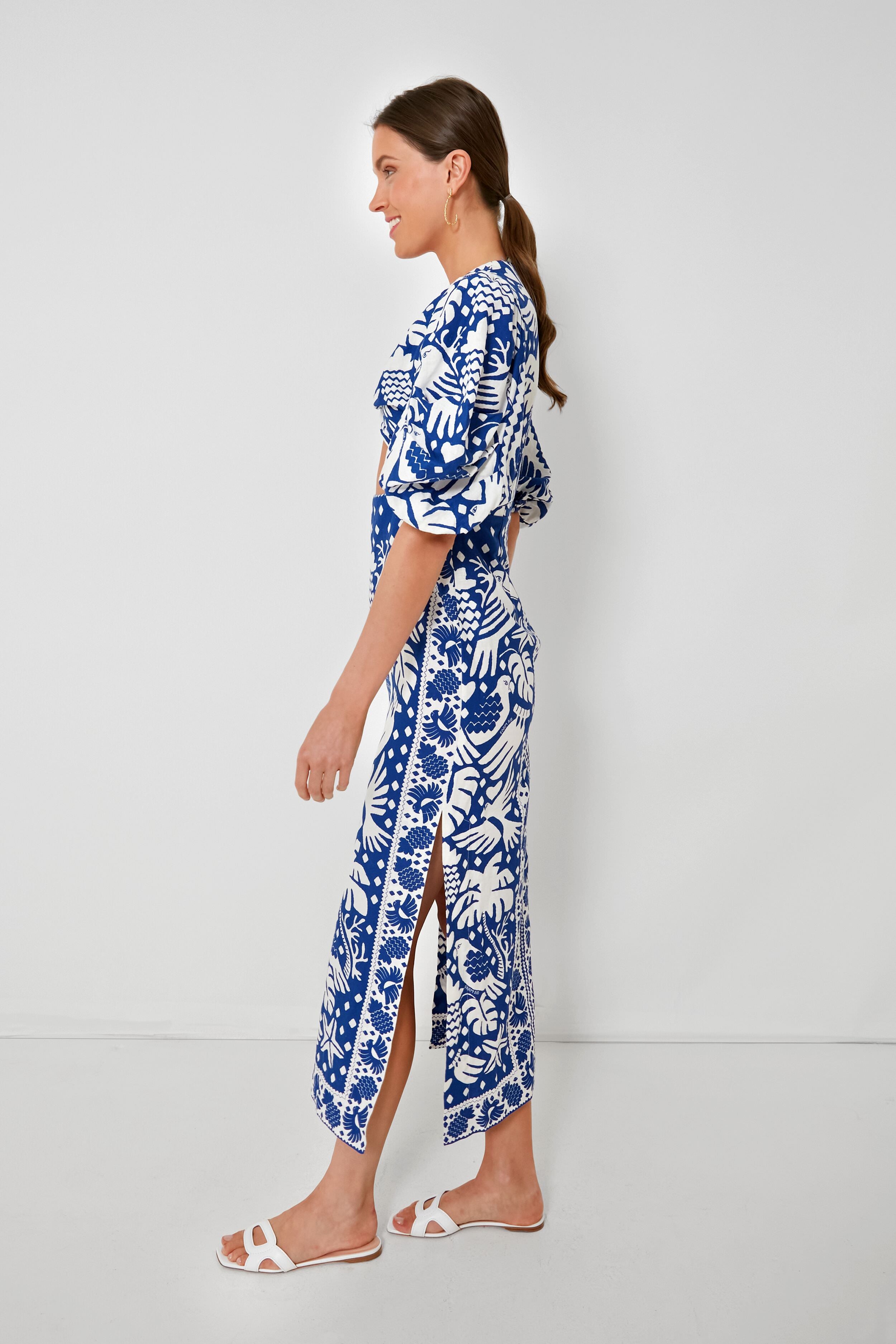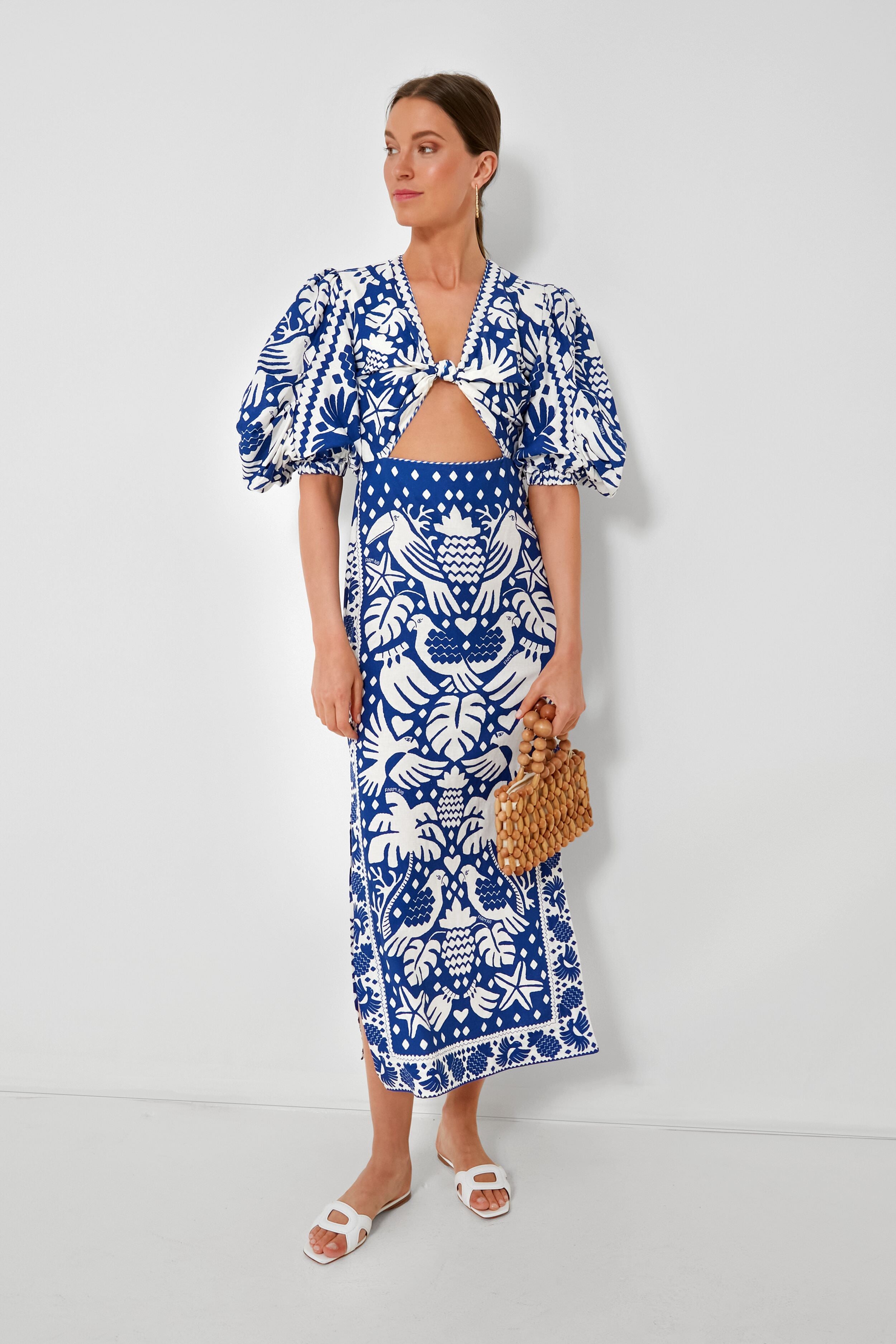 Dramatic puff sleeves frame the boldly patterned Jungle Scarf Navy Dress to create something incredible. In stunning shades of cobalt blue and bright white. this midi is all kinds of eye-catching and jaw-dropping — like. come on. look at that deep V-neckline and knotted bodice with a sleek cutout! Complete with side slits at the hem to promote easy movement so you can dance around in it (and we know you'll want to!). this is the perfect event-ready silhouette when paired with heels and a clutch.