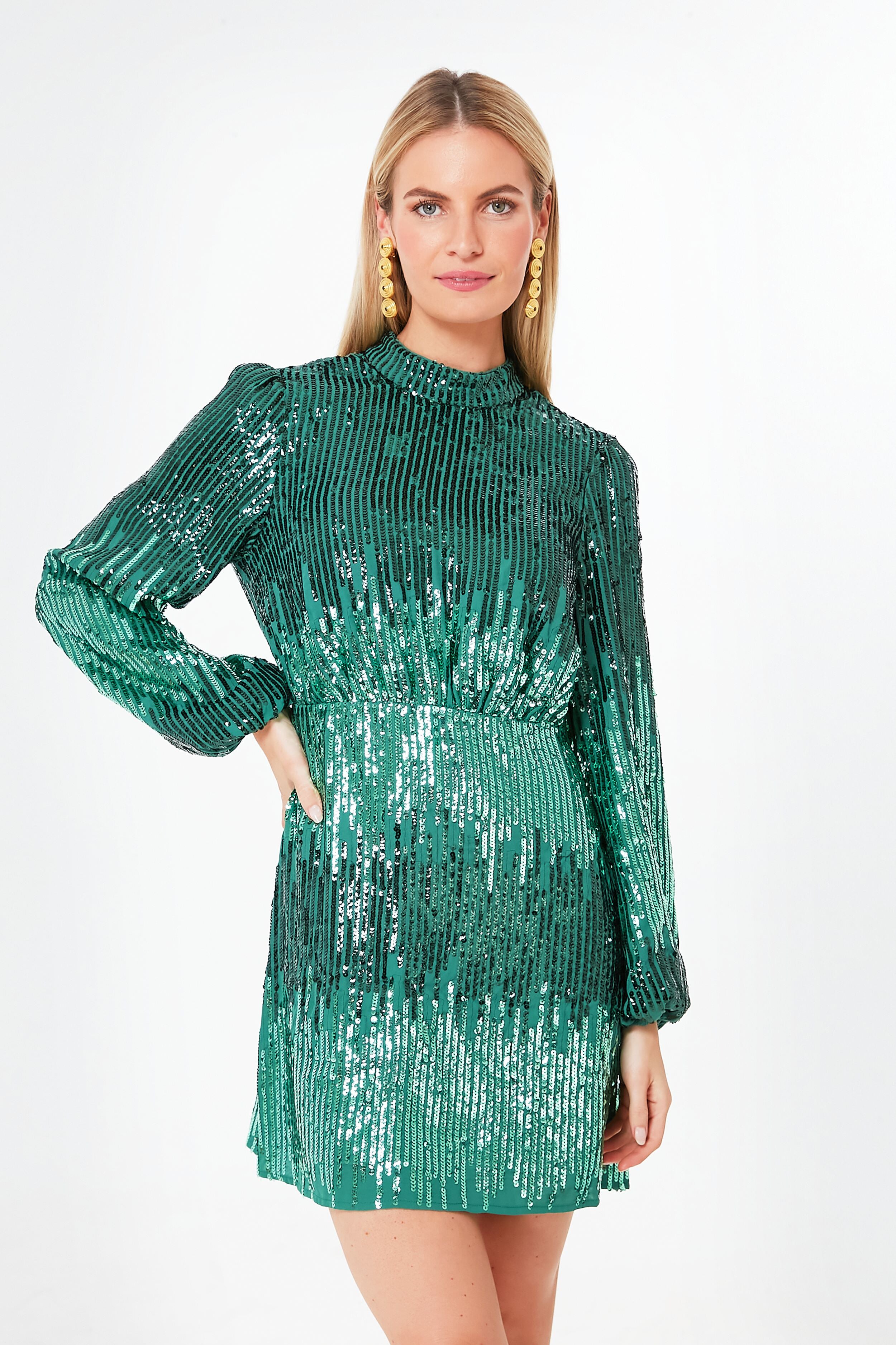 The Juniper Sequin Samantha Dress is an emerald treasure. inspired by the sixties and adorned with tonal sequins that catch the light (and probably some eyes too!). An effortlessly polished silhouette. this mini features a mock neck. blouson sleeves with a slightly puffed shoulder. and a split hem that makes it easy to dance the night away without feeling constricted. Add your best party shoes and a pair of statement earrings. and then you have a perfect recipe for a great night out.