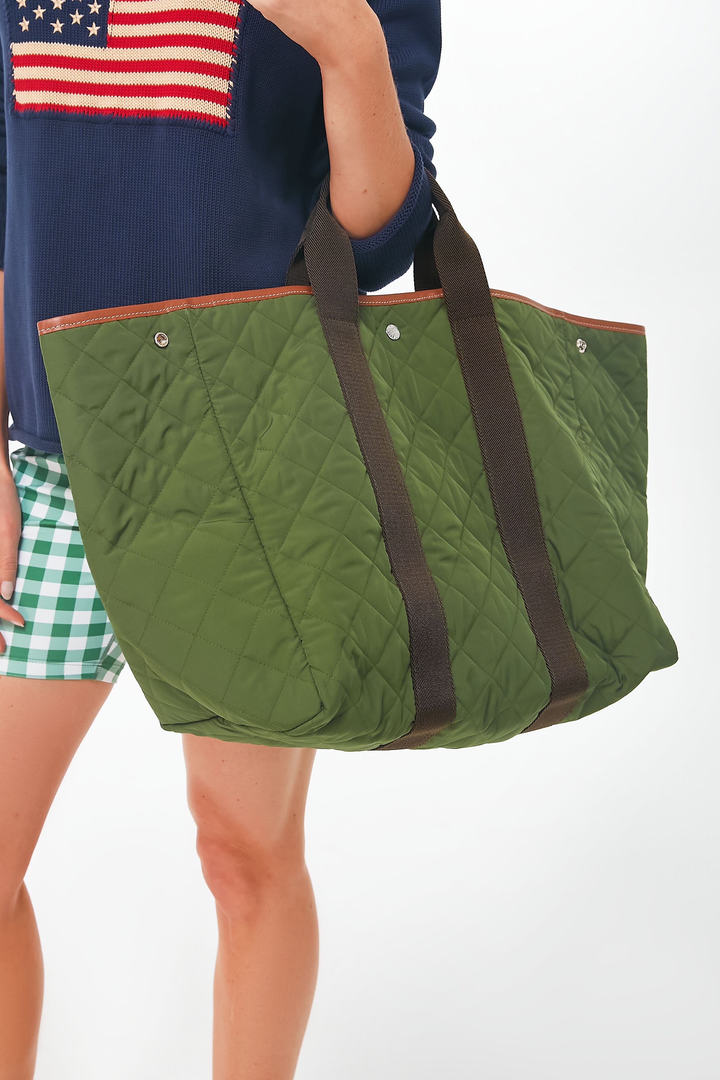 The Kaki Traversee L Tote is the perfect travel companion that stands out from the crowd. In a quilted rich olive green that's contrasted by the dark brown straps and leather trim. this stylish number is as practical as it is chic. With silver hardware and durable top handles. this style is perfect for a quick getaway or a busy day running errands. this tote will make bustling around just that much easier.
