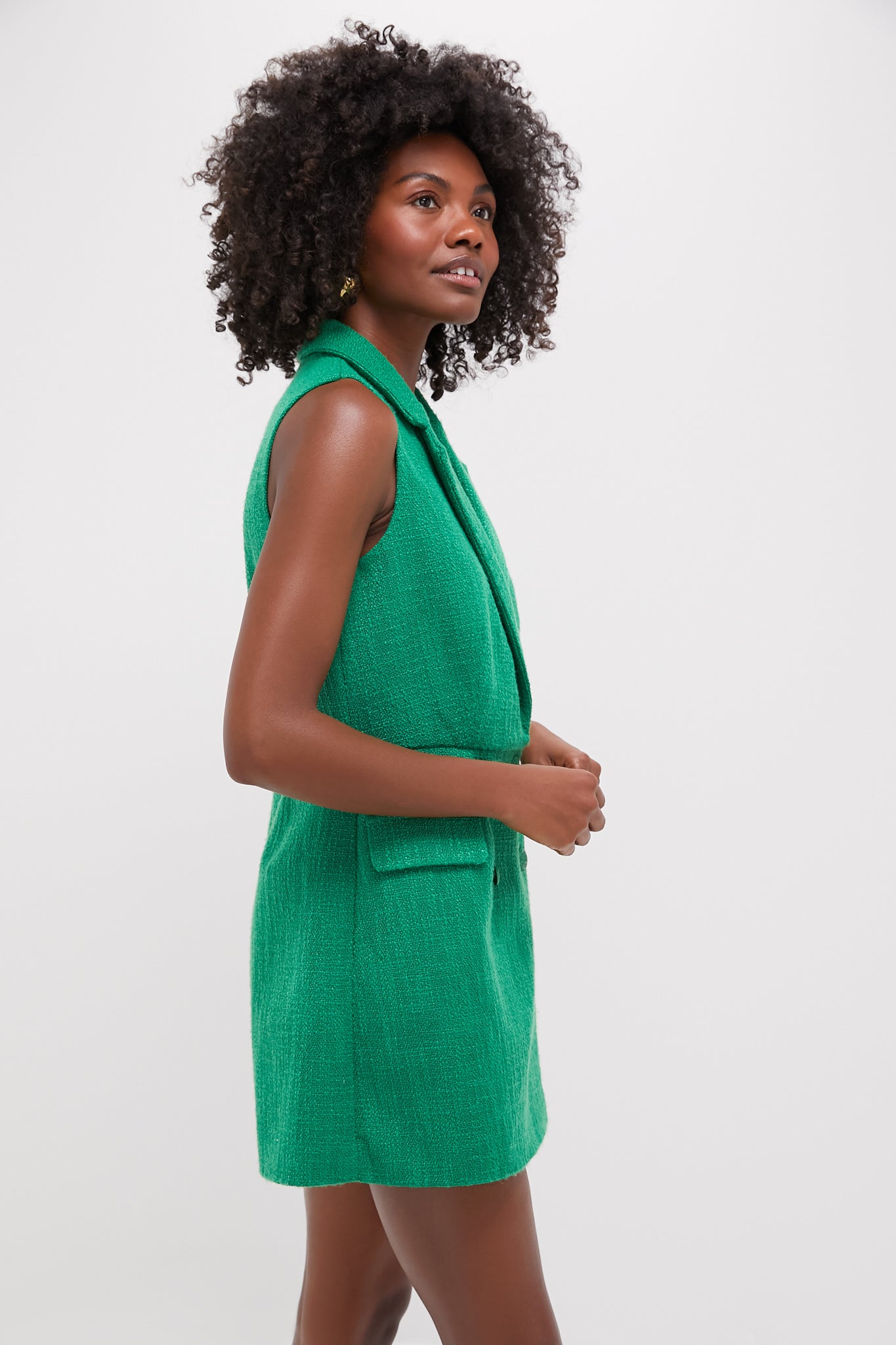 We are obsessing over the Kelly Green Tweed Campbell Romper. the ideal desk to drinks warm-weather style! This sophisticated silhouette features a classic. yet modern construction. with a notch collar. front flap pockets. and double front buttons. Pair with loafers for the office. and switch into strappy flats for happy hour!