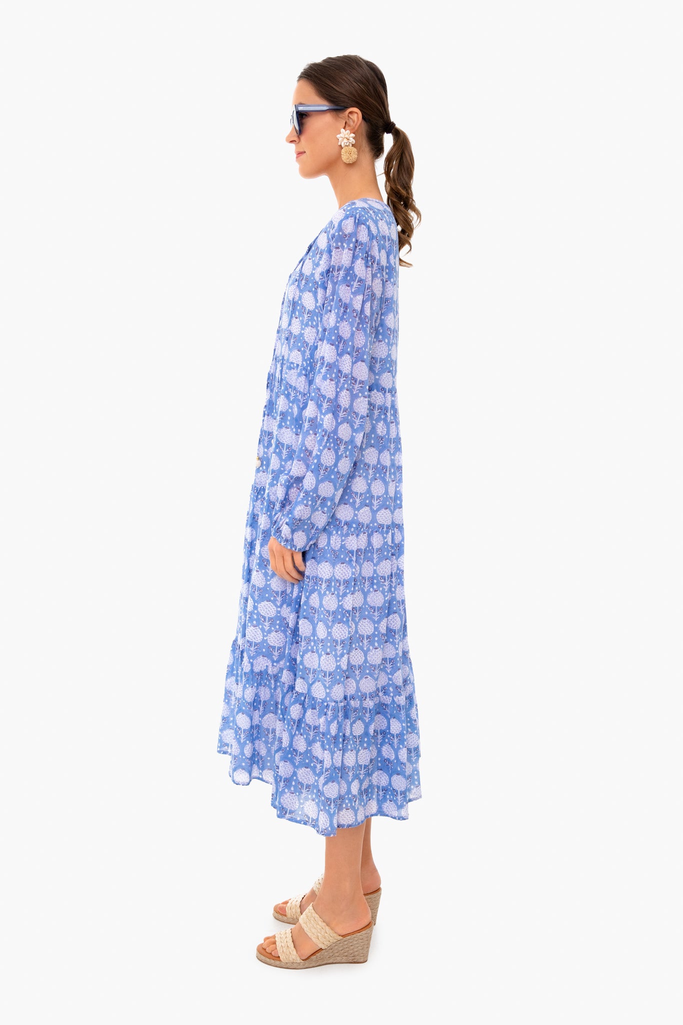 The Kerachi Blue Long Sleeve Midi Dress is made from a breezy block printed cotton. This style features a split neckline. long blouson sleeves. and a tiered midi skirt. Pair with raffia accessories and sandals for an island-inspired date night look.