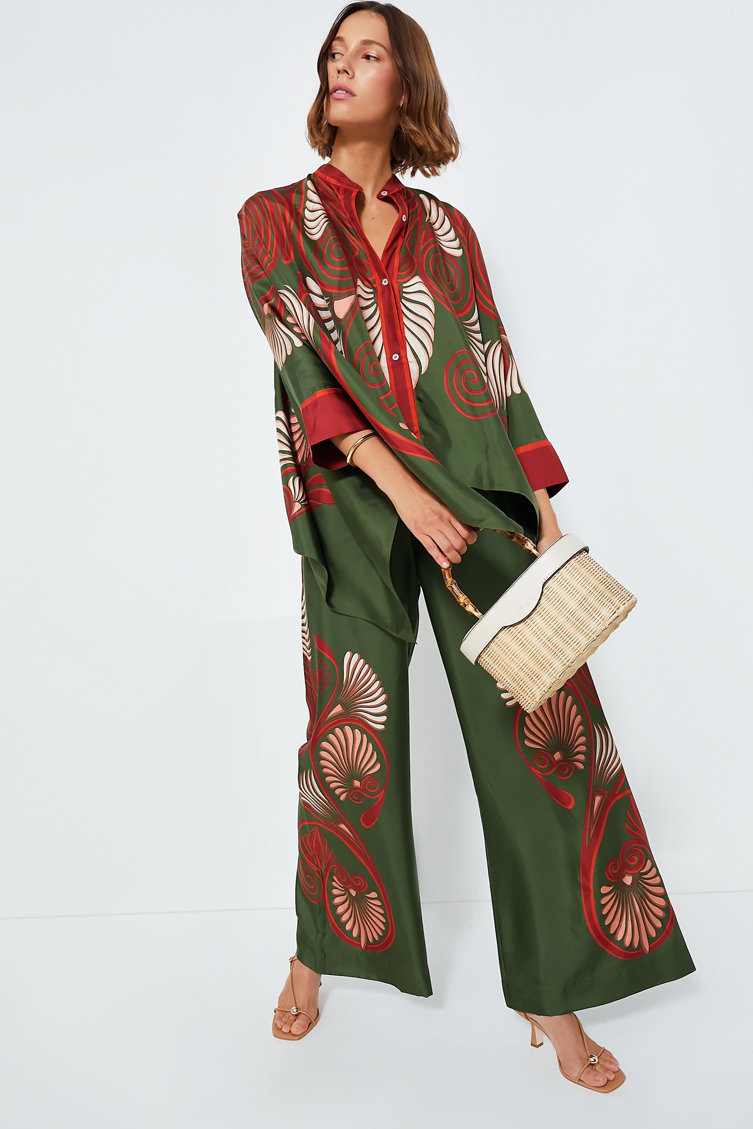 The Kerylos Placee Palazzo Pants are the standout style your closet needs. These trousers sit on the waist and fall flared. with a wide. breezy fit through the legs – like a skirt. but with the comfort of pants. A bellissima wardrobe addition in this chic and timeless print. Even better- pair with the matching Kerylos Placee Foulard Shirt for the full set!
