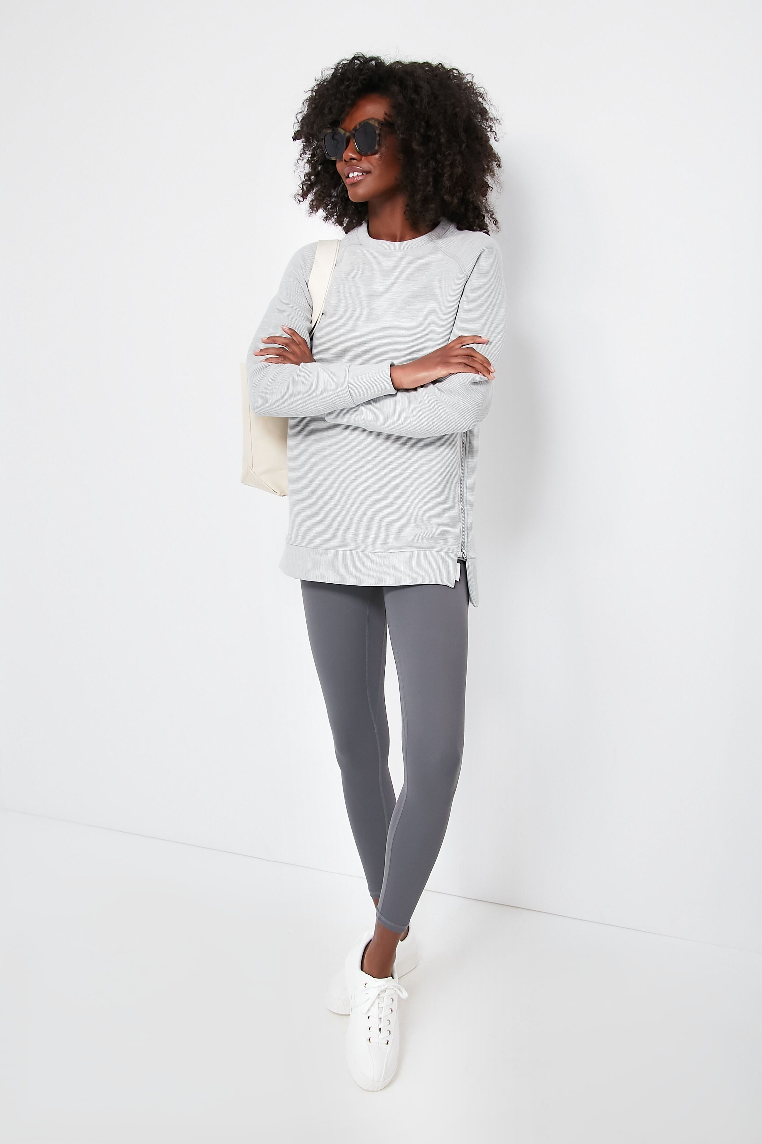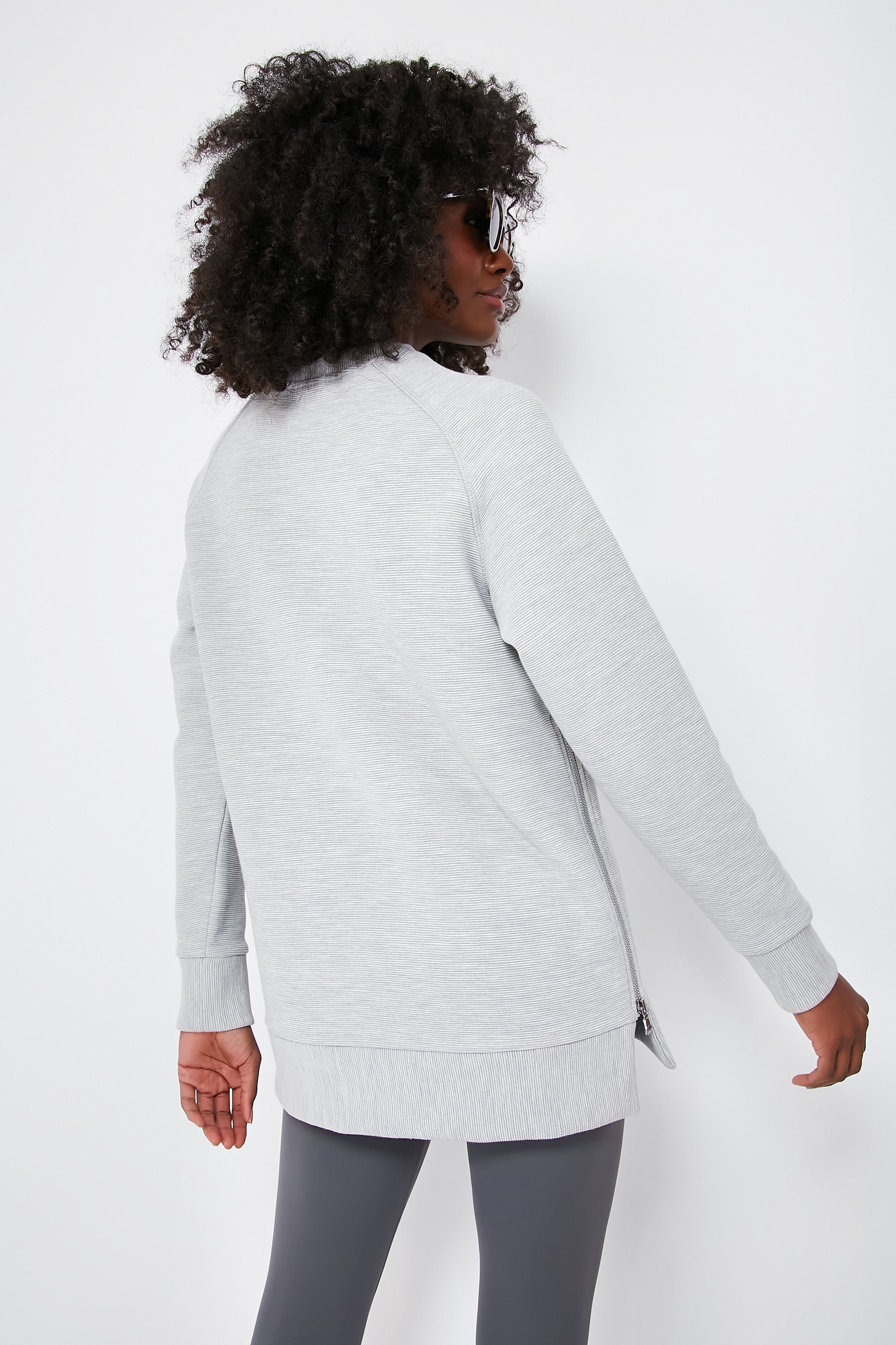 The boxy. oversized Light Grey Marl Manning Sweatshirt is cut from ottoman rib fabric. designed to take you from barre to brunch and back home with comfort and style. This casual-chic crew features a dropped back hem to provide extra coverage when you want it. while contemporary size-zip detailing allows for versatile styling options and an adjustable fit for when you want a more relaxed feel. Add leggings as you head to your morning workout and swap them for sweats for an easy WFH outfit that requires zero thought.