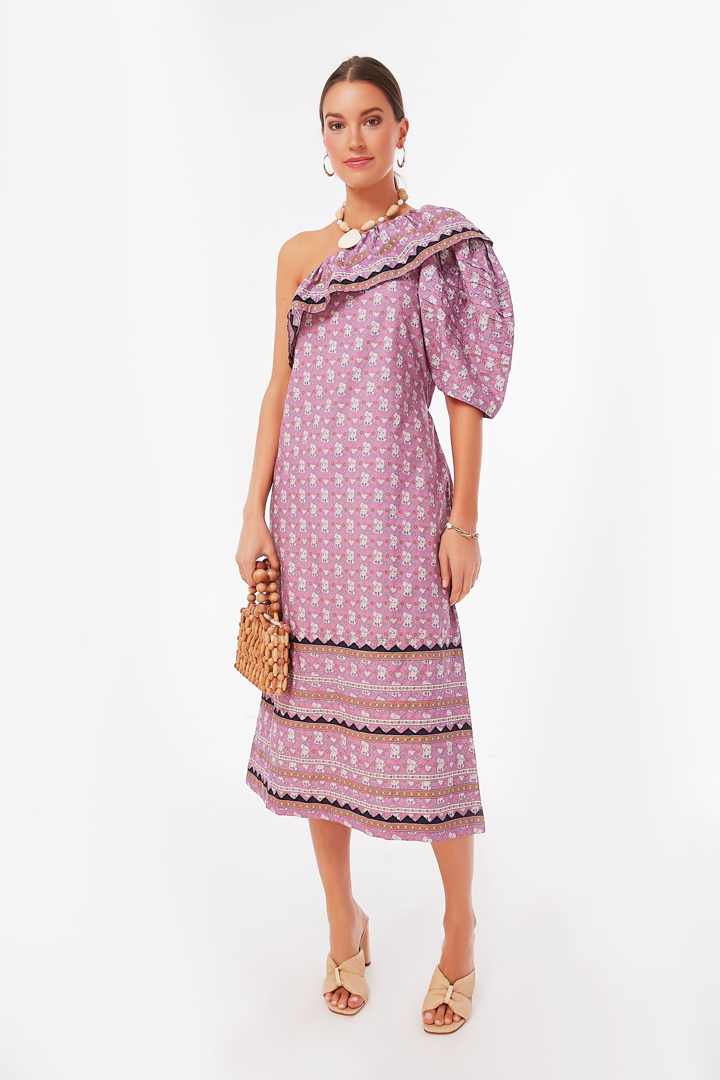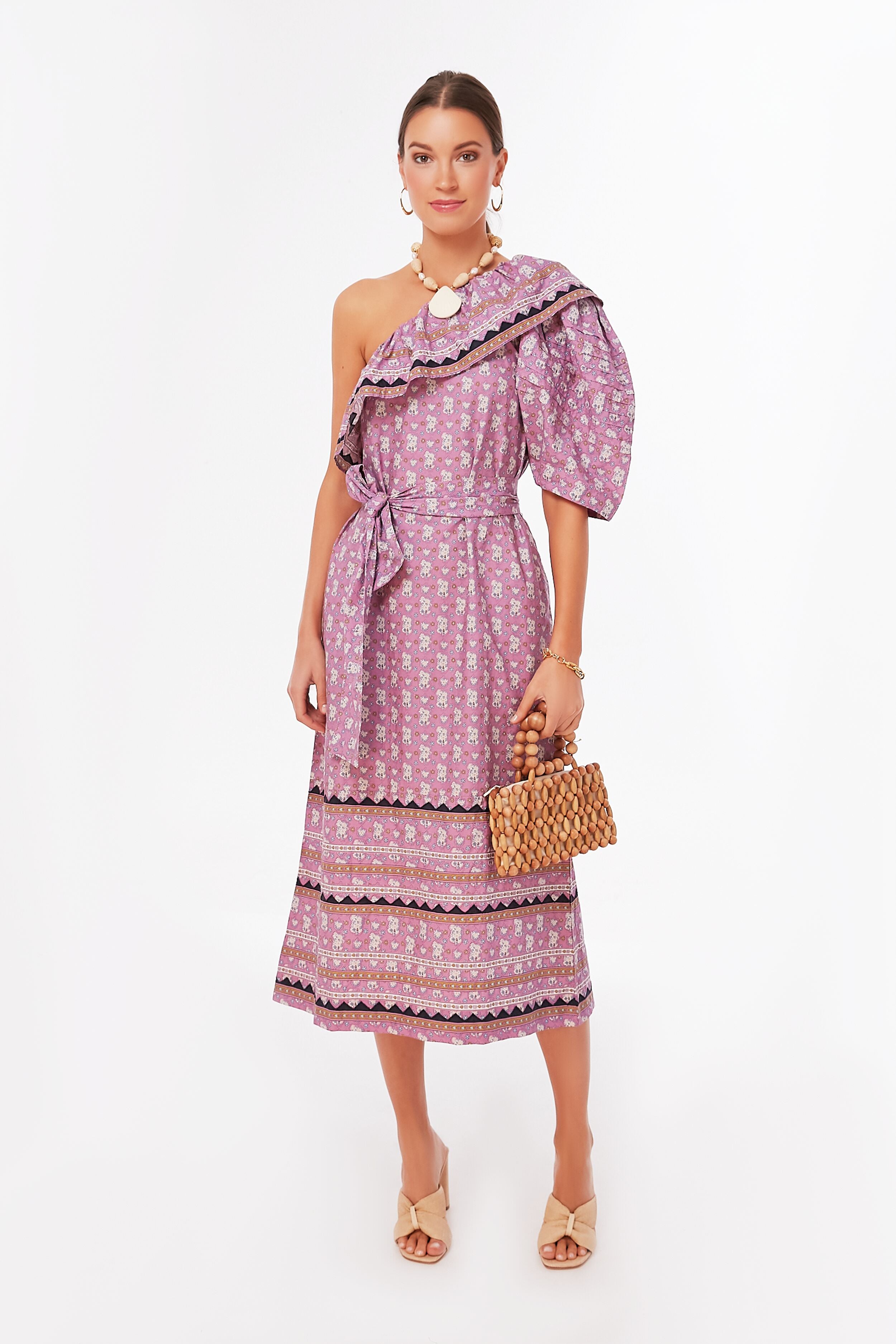 The Lilac Perry Border One Shoulder Dress is a gorgeous midi that features thoughtful details that you are sure to fall in love with. An asymmetrical neckline effortlessly transforms into a pleated puff sleeve and an optional waist belt makes it easy to transform your style. tie the sash for a cinched waist or remove it for a relaxed look. Pair with heels and beachy accessories for your next warm weather getaway.