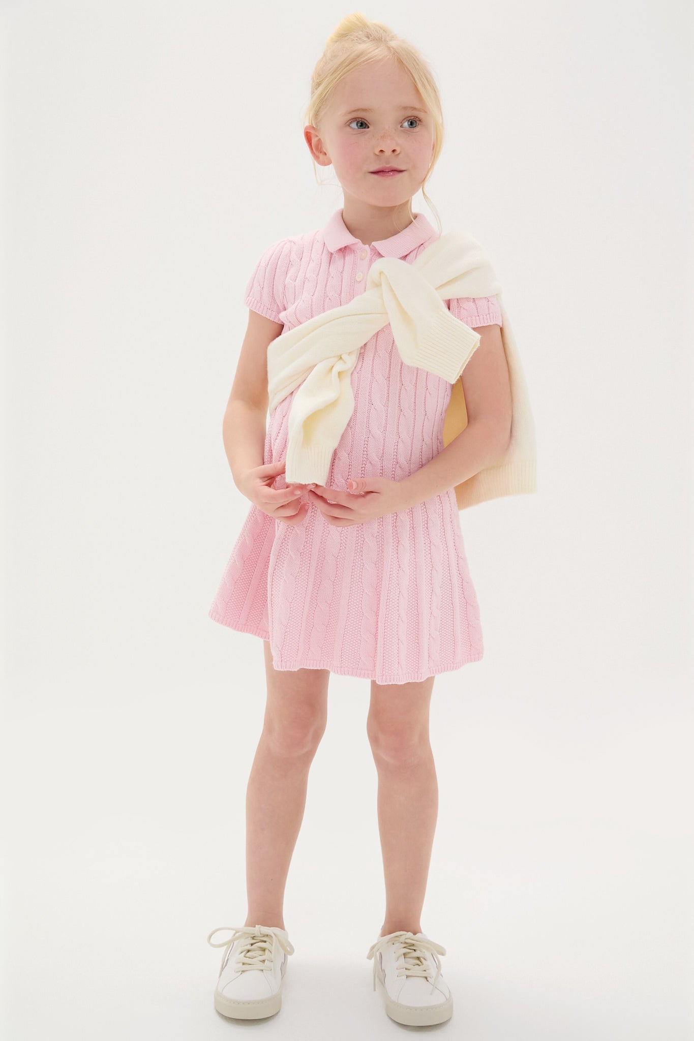 The Little Girls Short-Sleeve Cotton Cable Knit Polo Dress is a classic for your little fashionista. With an A-line silhouette. Polo collar. and puffed short sleeves. your little one is sure to twirl in this dress!