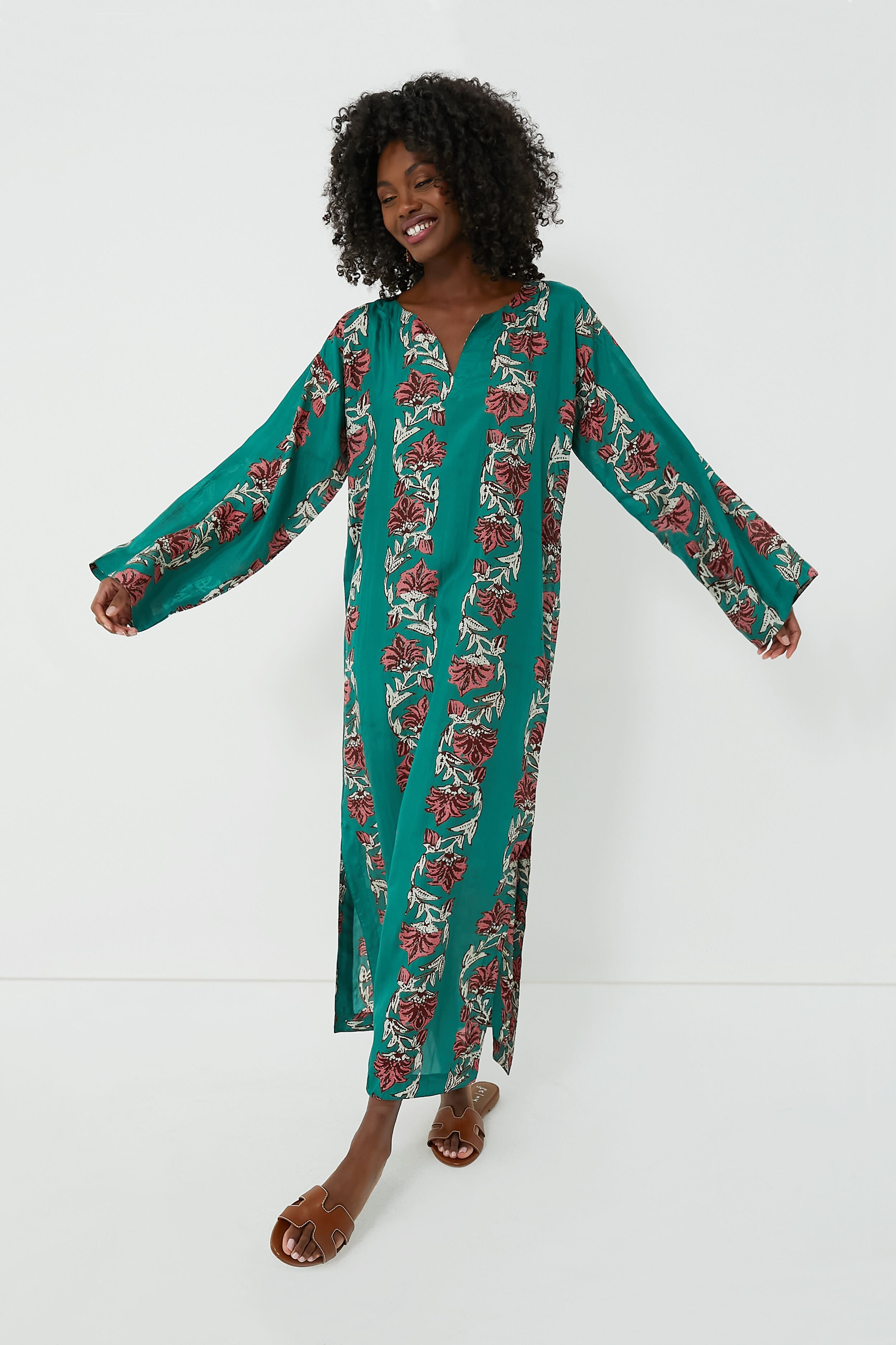 Slip right into the Lotus Stella Kaftan! Hand-dyed and blockprinted by artisans in India. this flowy. '70s-inspired silhouette features a split neckline. an optional belt which can be used to cinch the waist. and side slits at the hem for easy movement. In a striking green hue. this piece stands out from the crowd and is great for on-the-go. Style with crisp white sneakers. hoops. and a shoulder bag for vacation travels. or pair with strappy sandals and sunnies for dinners al fresco.