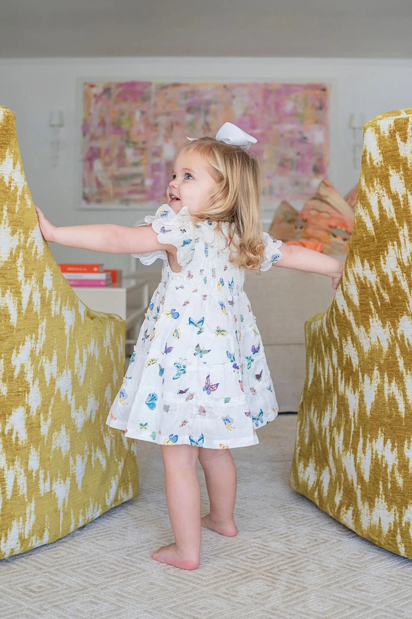 The Madame Butterfly Mimi Dress is relaxed take on a smocked silhouette whose soft butterflies will make your heart flutter. Crafted from organic cotton sateen and finished with scalloped ruffle collar and sleeves. this dress is perfect for special occasions or everyday wear. Pair it with cute ballet flats and a matching headband for a charming. polished look.