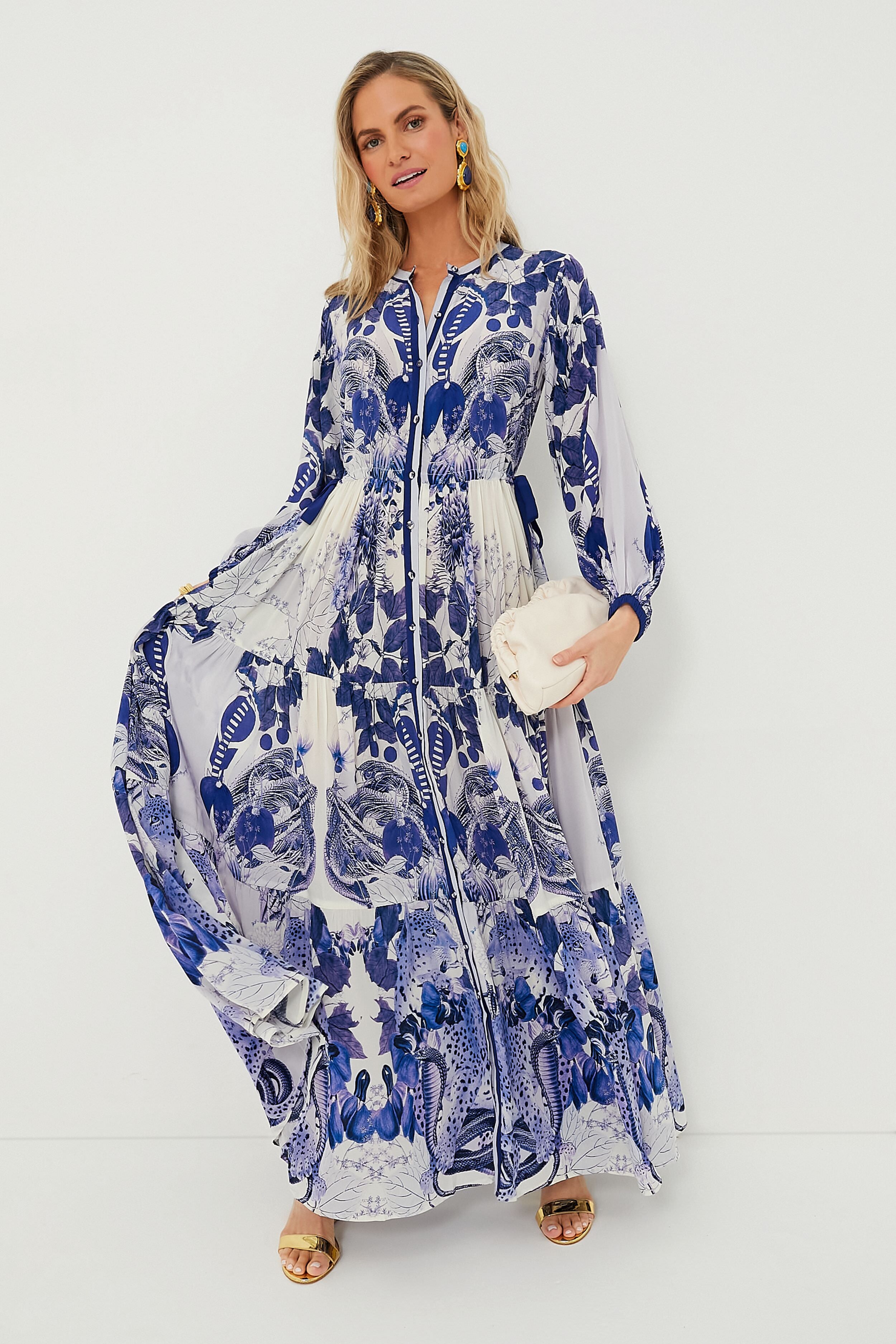 Nothing feels better than finding the perfect. easy-to-wear outfit. like the Magestic Amnis Sepia Josefina Dress! Crafted from sustainable georgette with a lovely blue floral print. this maxi boasts long blouson sleeves with cuffs. full button placket and a tiered skirt that gently sways as you move. Pair it with sandals and a hat for a sunny day at the park or wear gold earrings and heels for a dinner date.